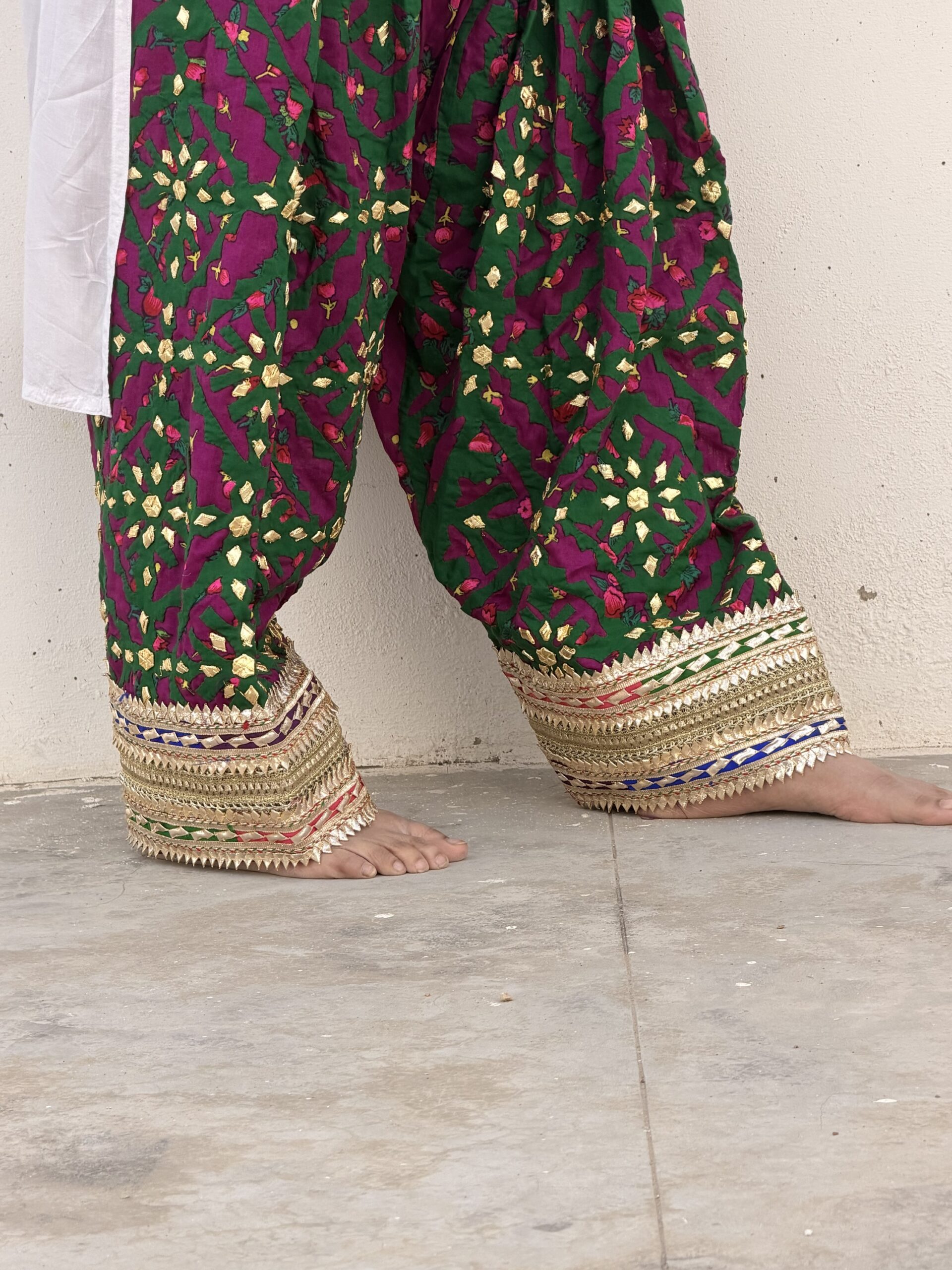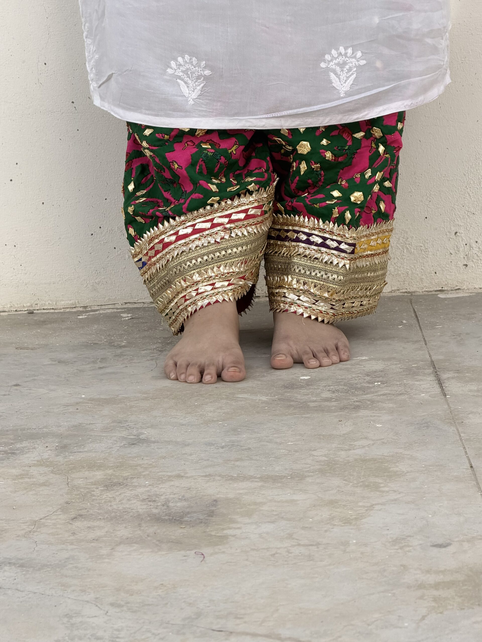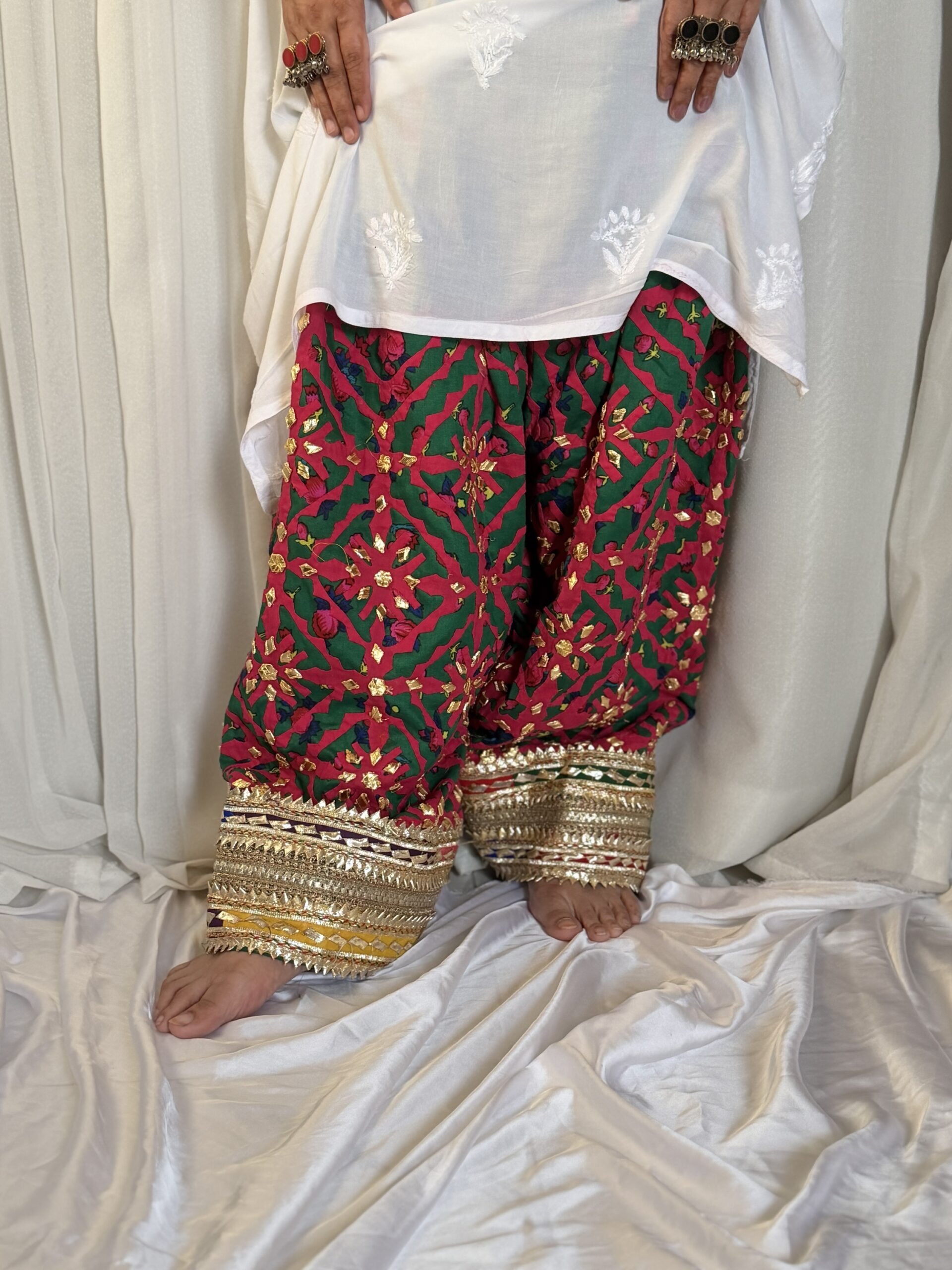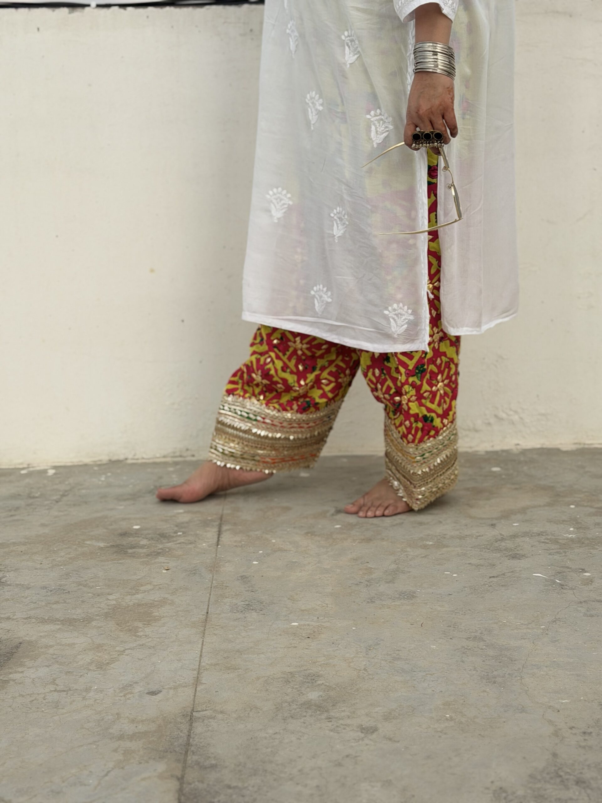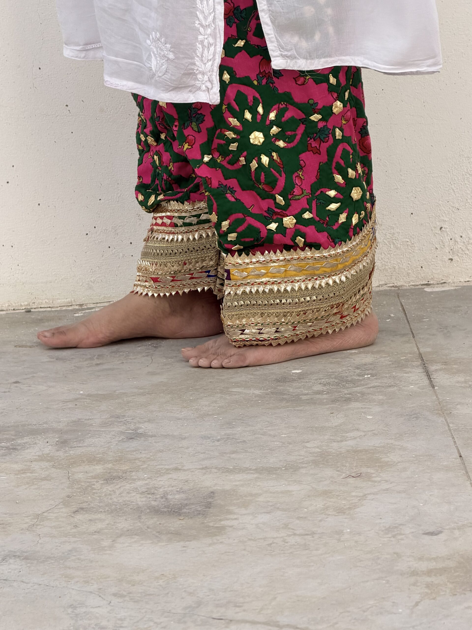 This floral handcrafted shalwar features traditional phulkari-style embroidery with vibrant pink and gold patterns. The design is finished with heavy gold gota work and colorful lace borders at the bottom for a festive look. It is paired with a simple white kurta to keep the focus on the detailed handwork of the shalwar