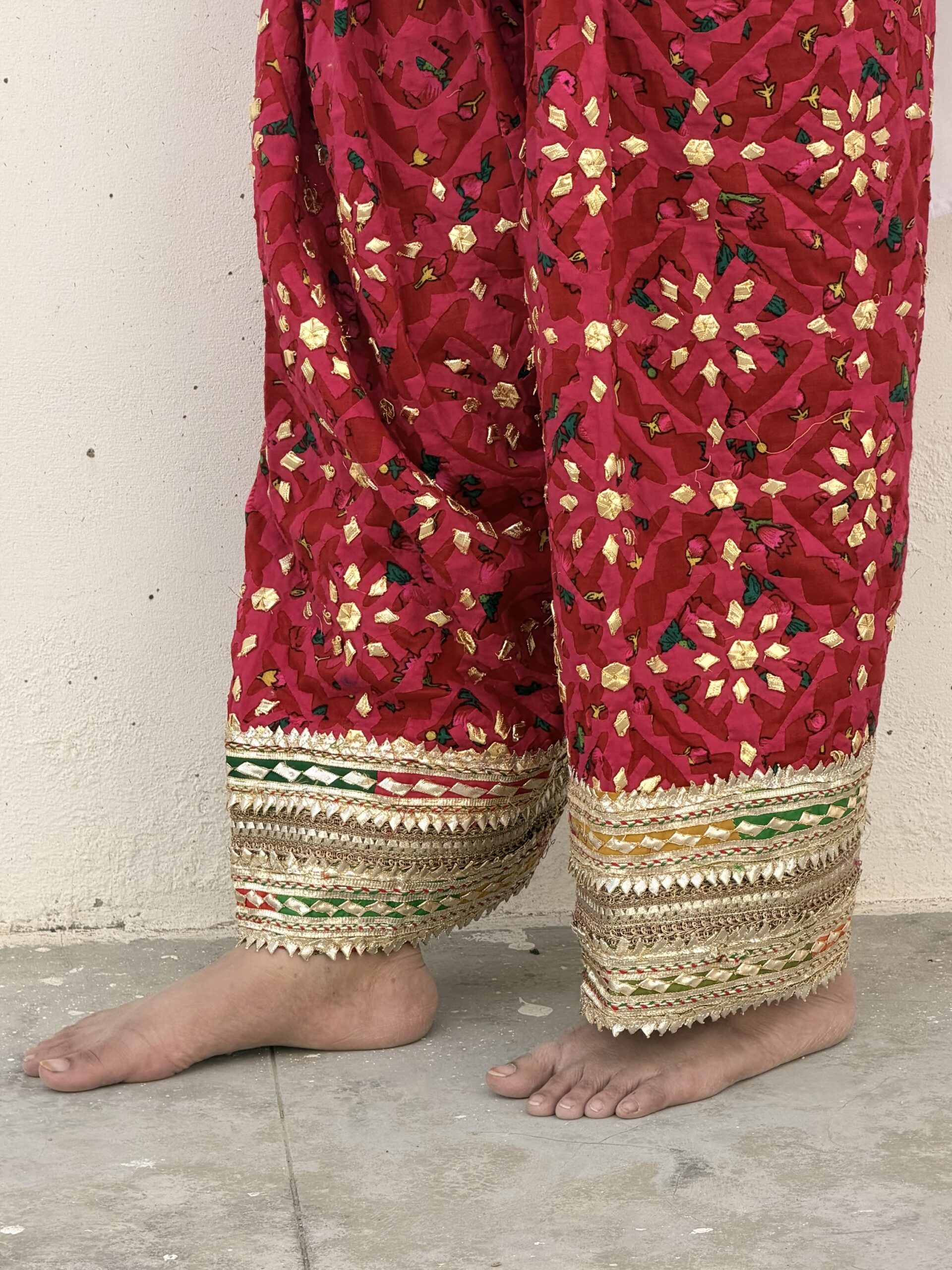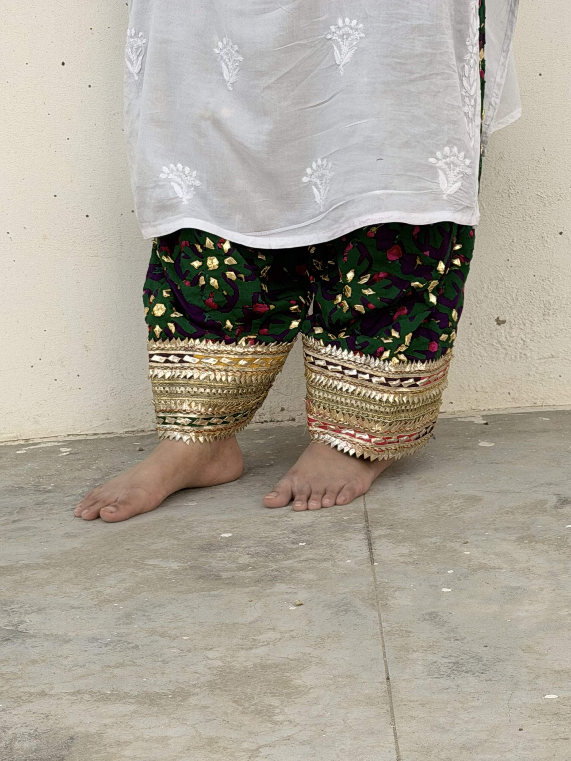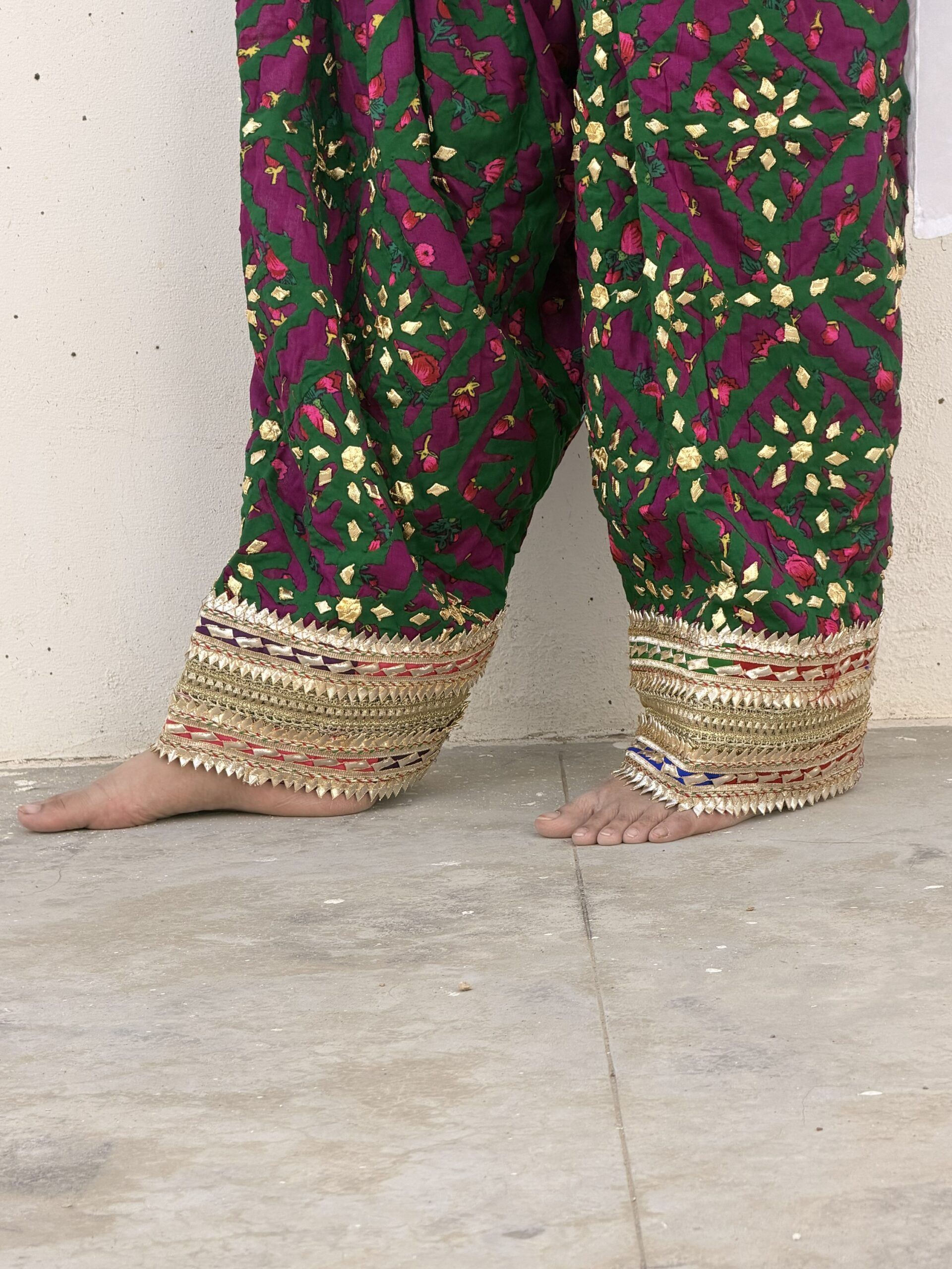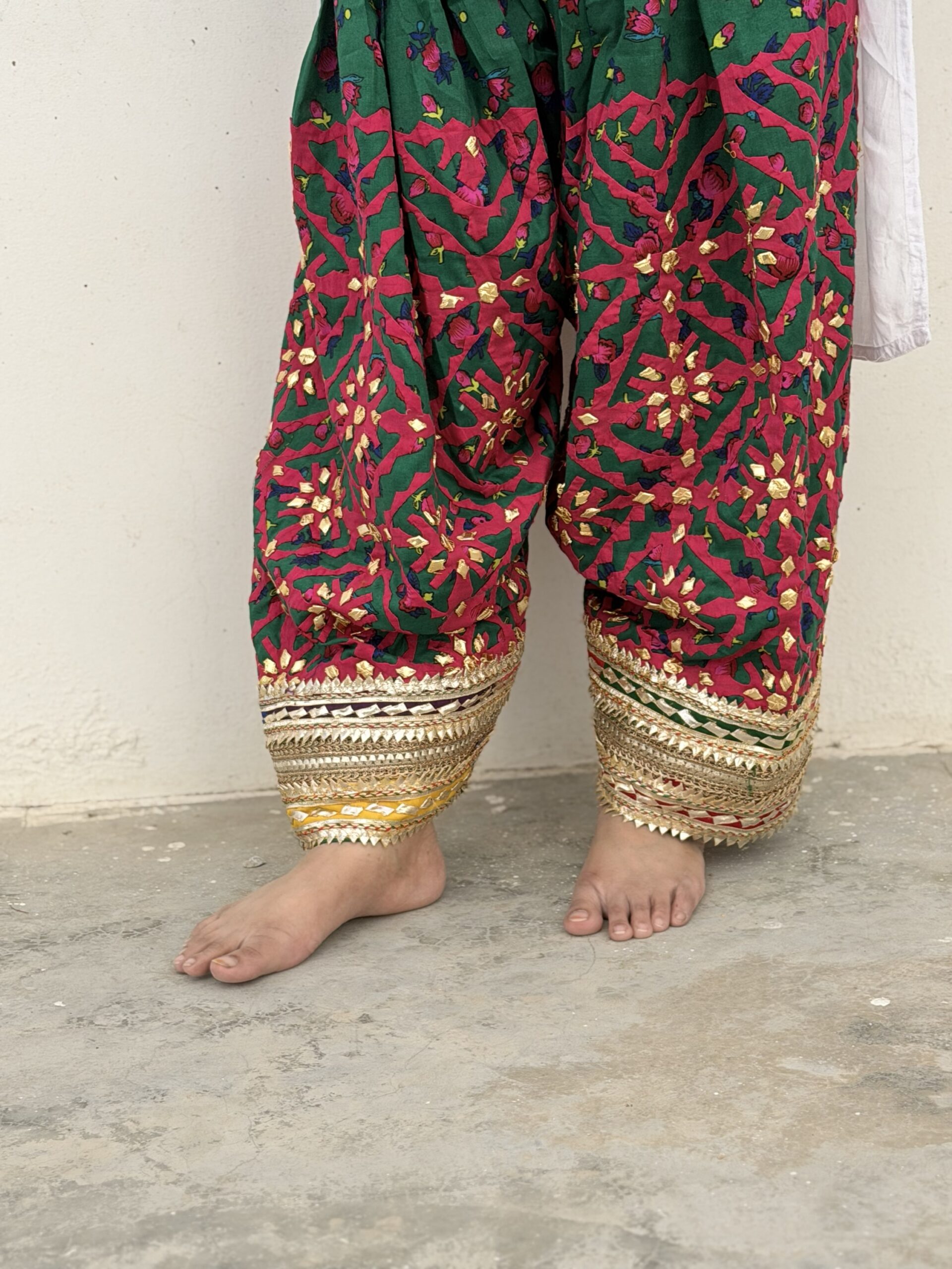 This floral handcrafted shalwar features traditional phulkari-style embroidery with vibrant pink and gold patterns. The design is finished with heavy gold gota work and colorful lace borders at the bottom for a festive look. It is paired with a simple white kurta to keep the focus on the detailed handwork of the shalwar