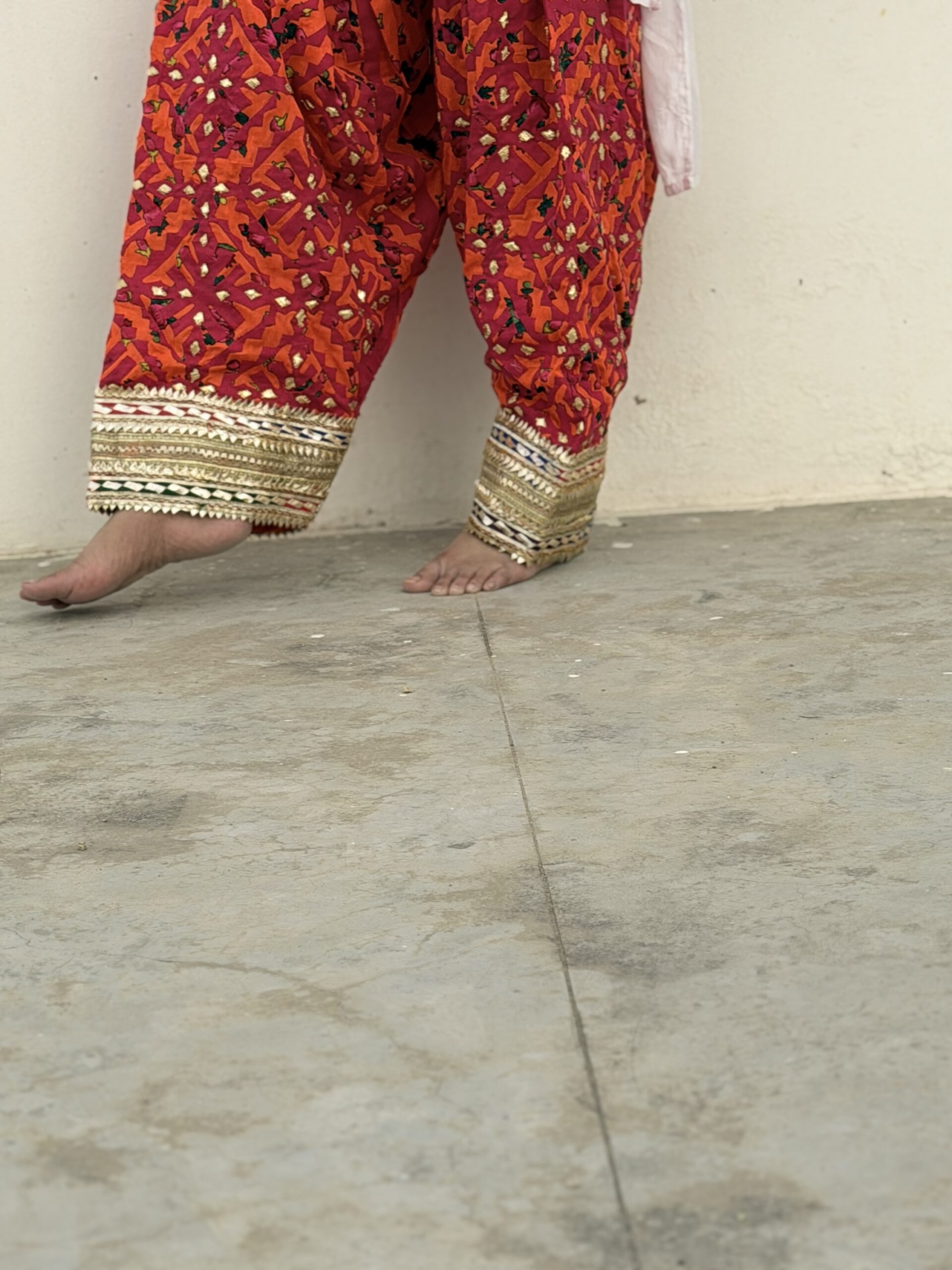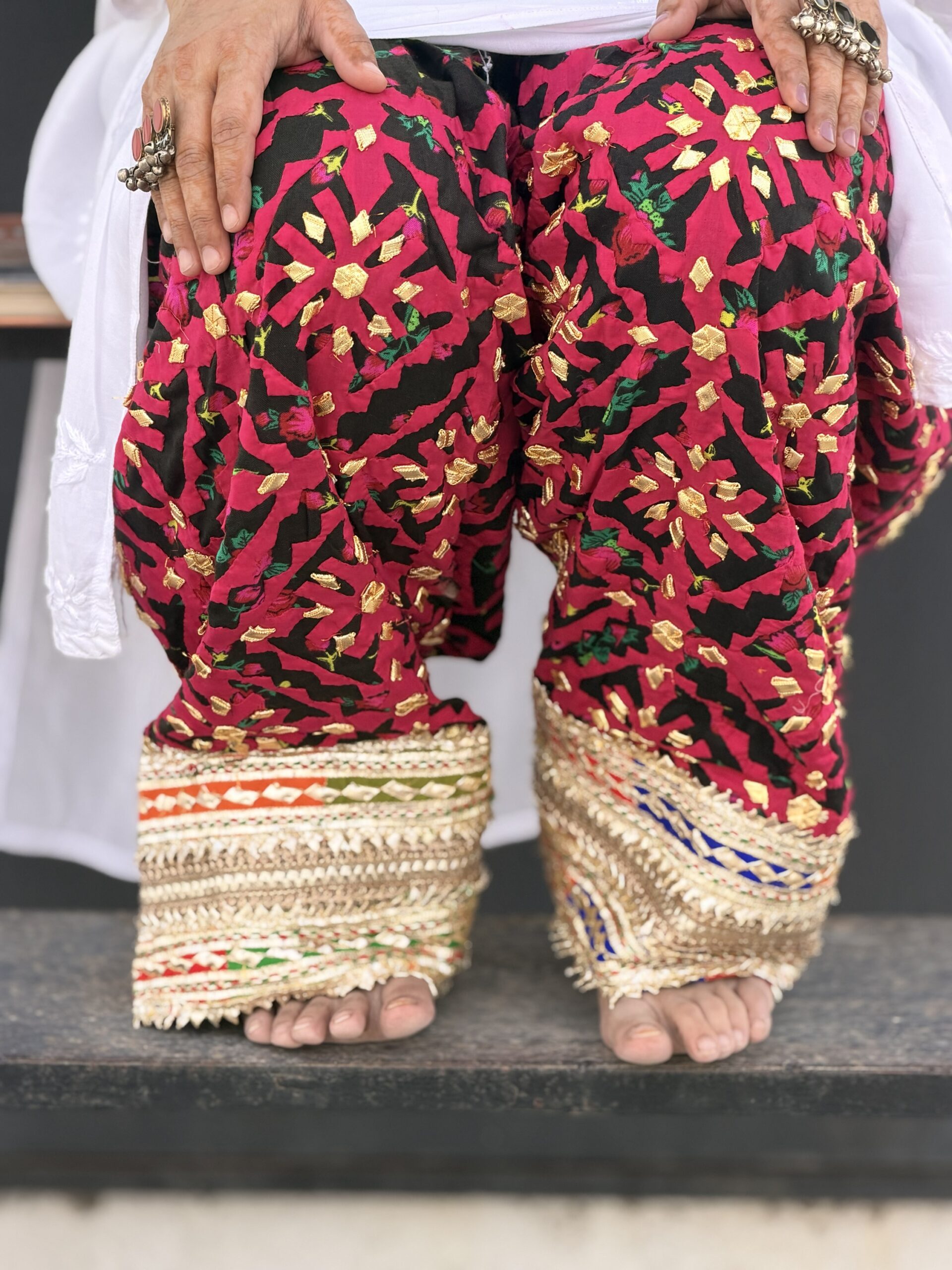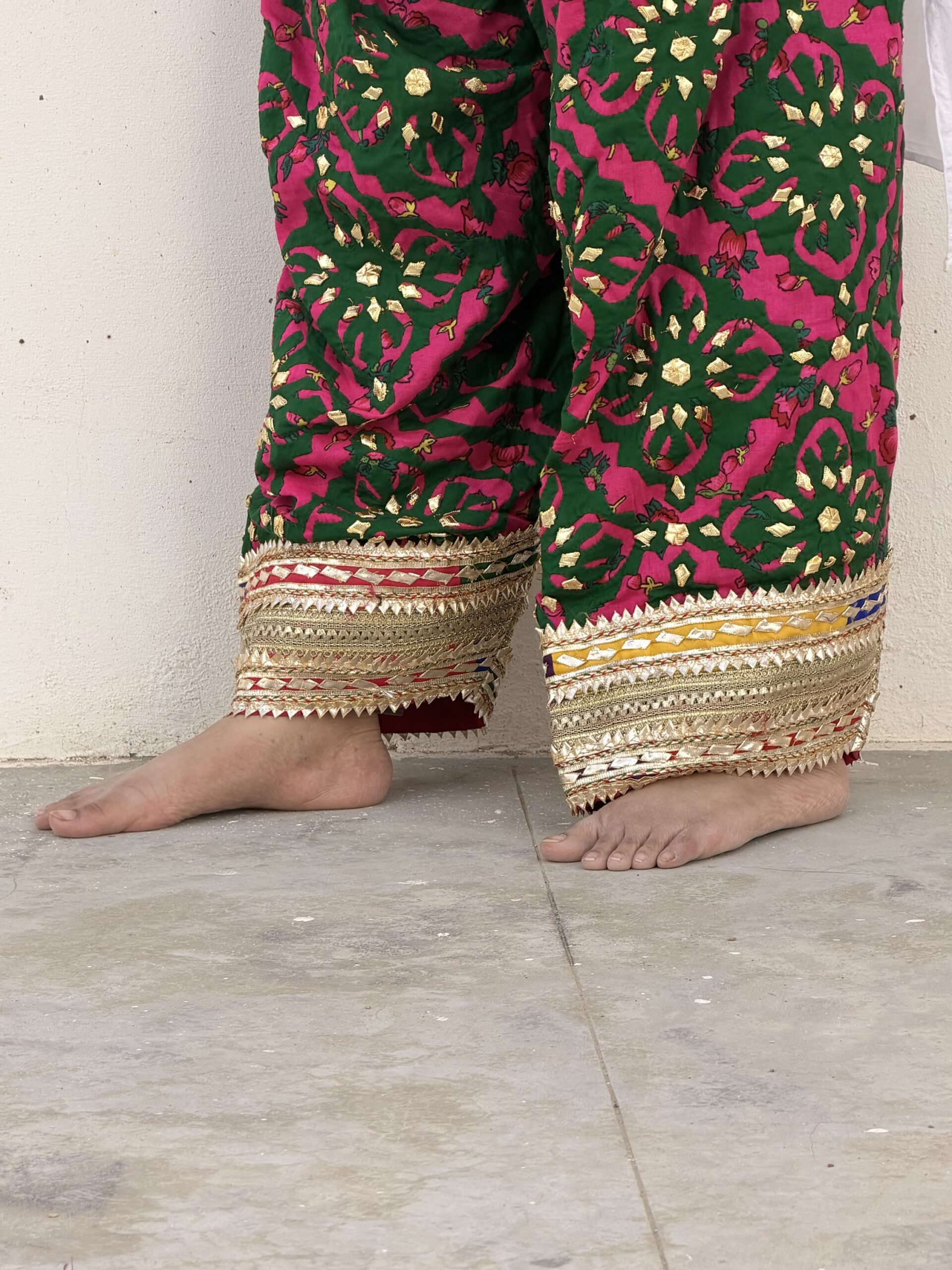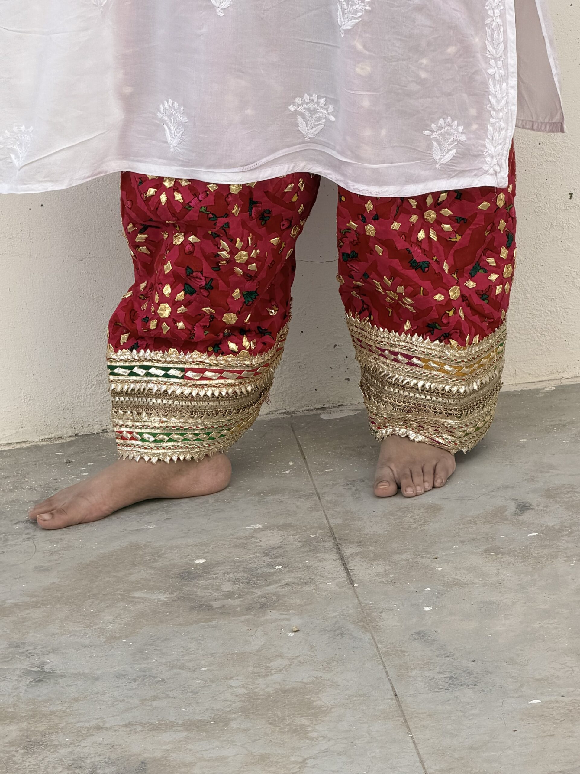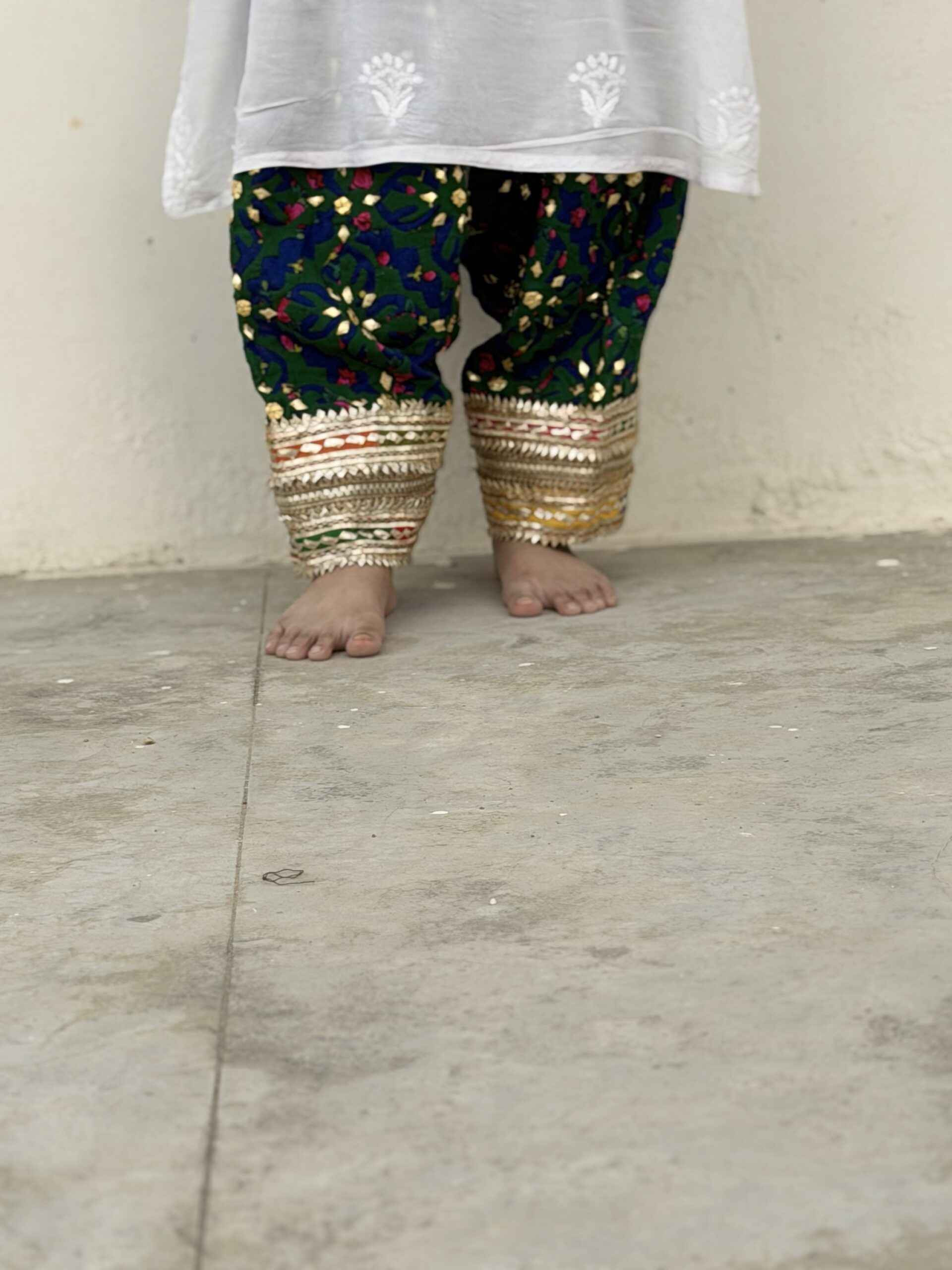 This floral handcrafted shalwar features traditional phulkari-style embroidery with vibrant pink and gold patterns. The design is finished with heavy gold gota work and colorful lace borders at the bottom for a festive look. It is paired with a simple white kurta to keep the focus on the detailed handwork of the shalwar