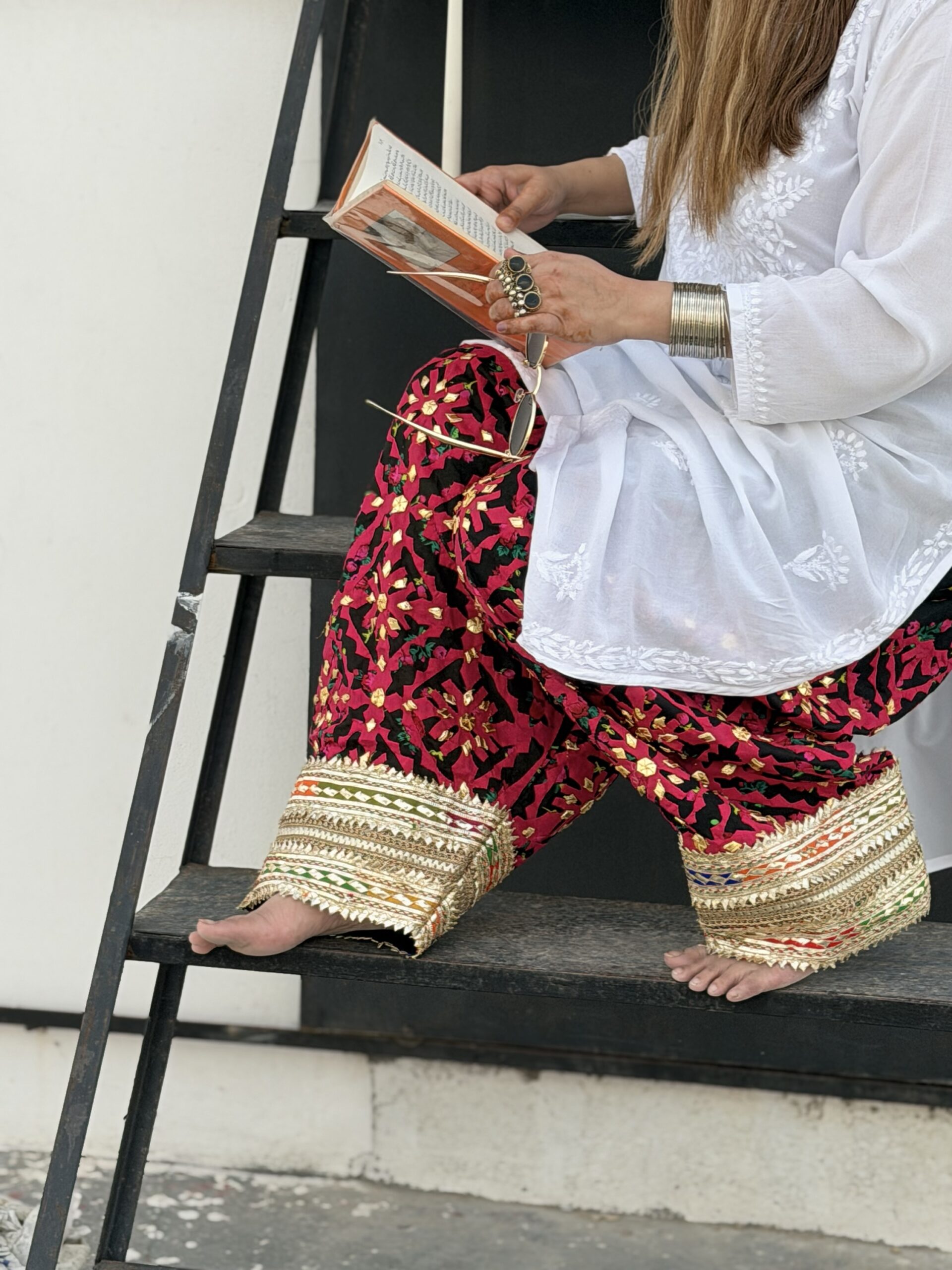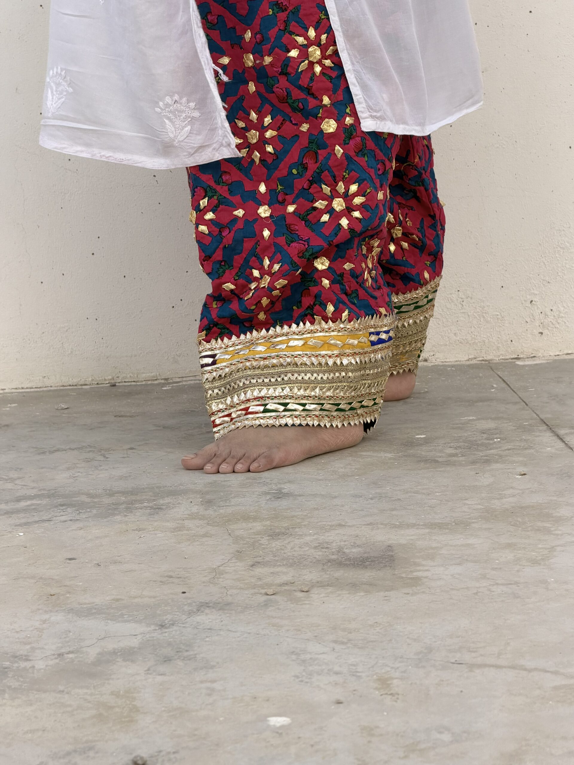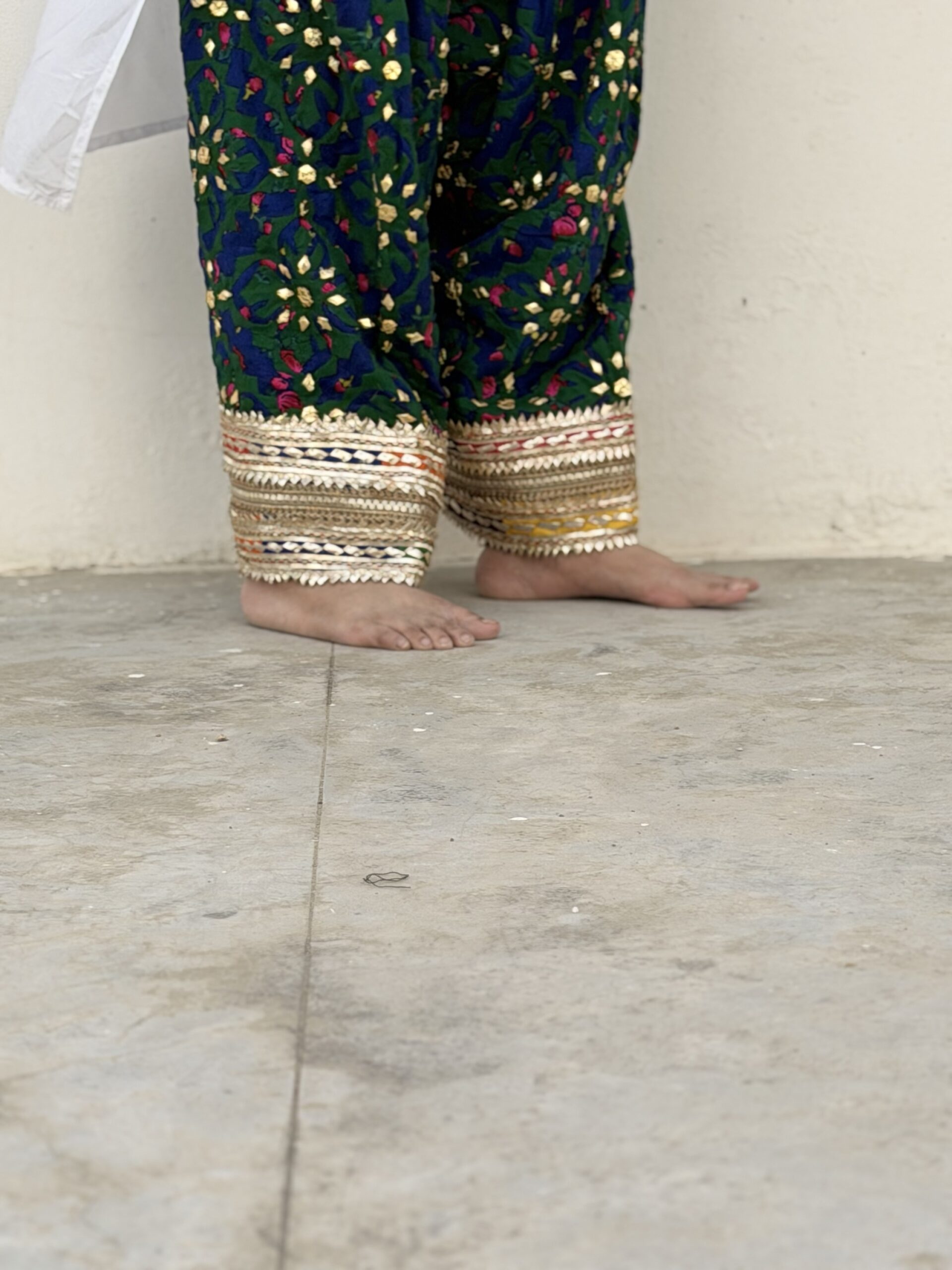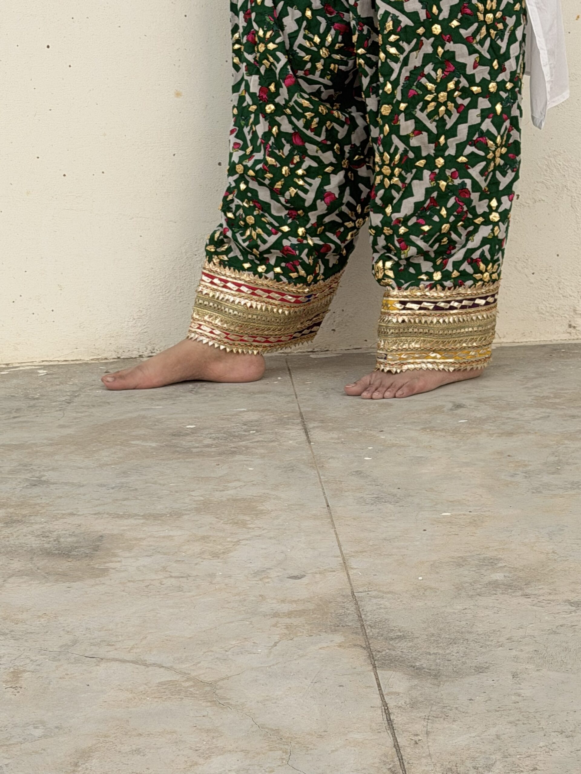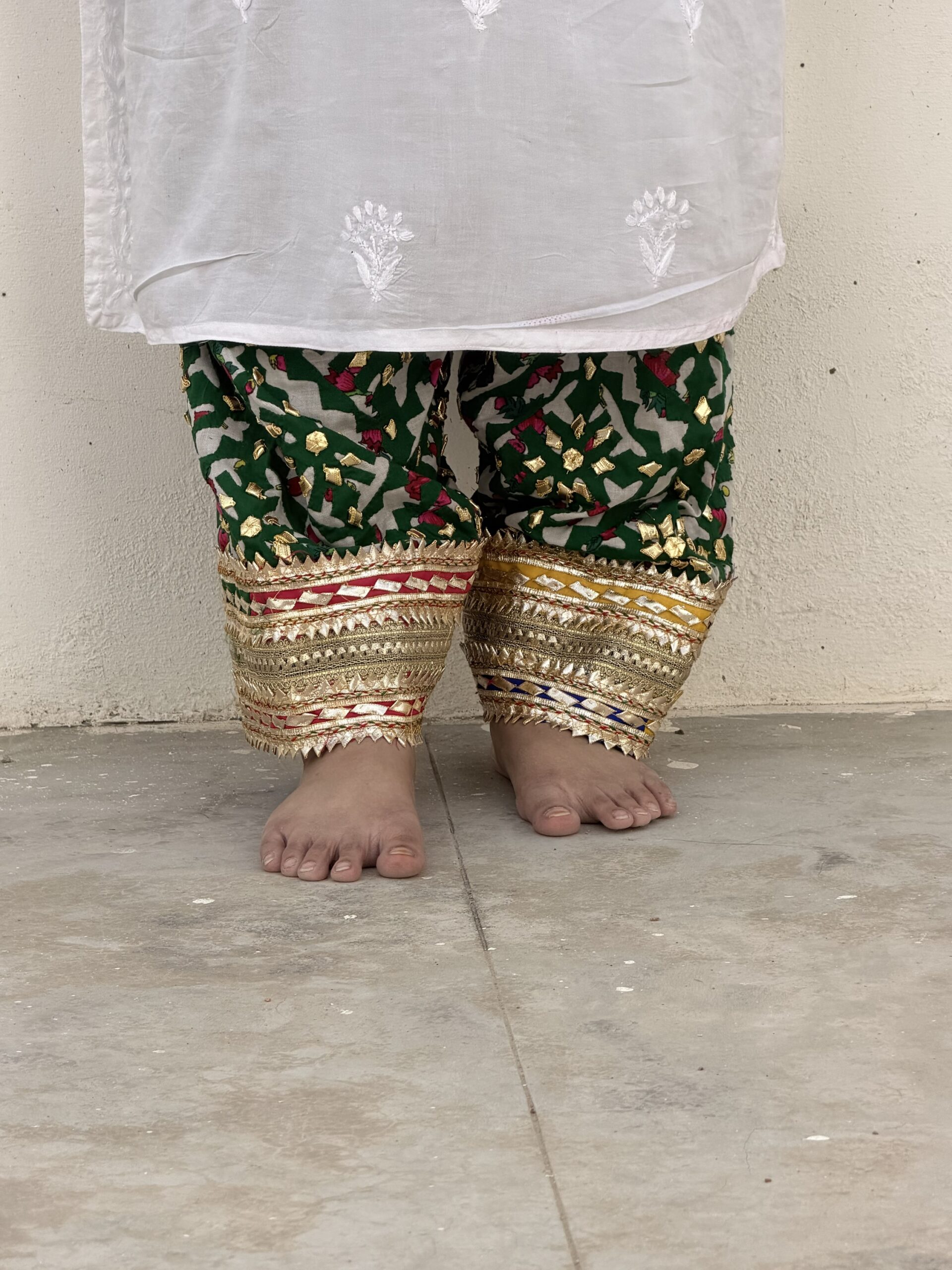 This floral handcrafted shalwar features traditional phulkari-style embroidery with vibrant pink and gold patterns. The design is finished with heavy gold gota work and colorful lace borders at the bottom for a festive look. It is paired with a simple white kurta to keep the focus on the detailed handwork of the shalwar