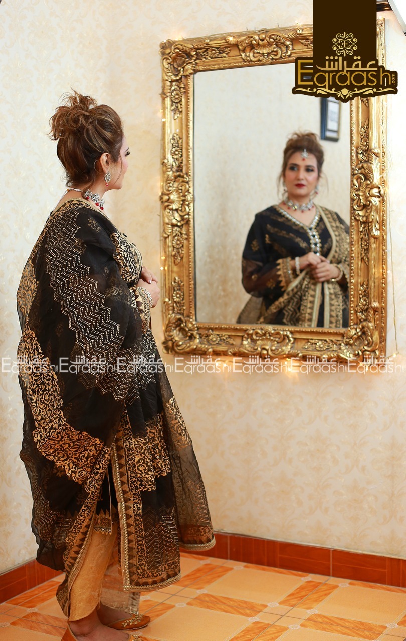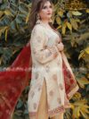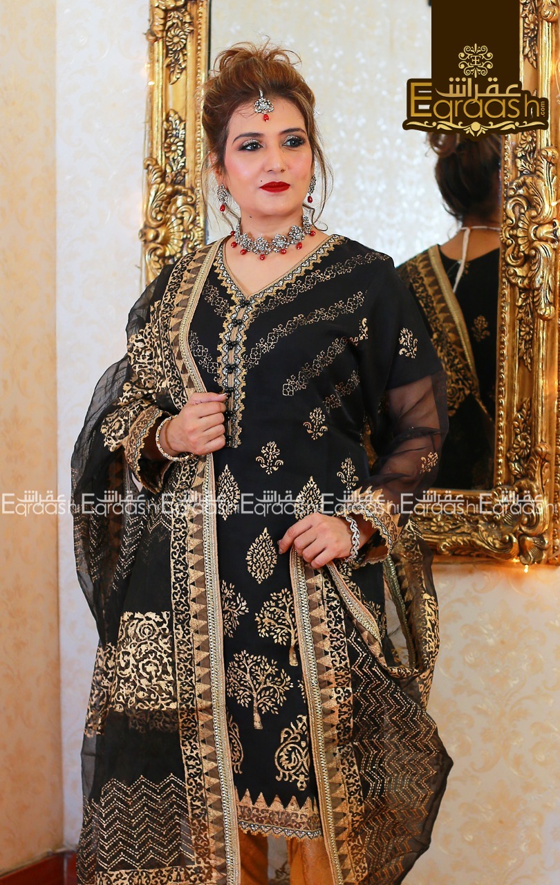 Luxurious hand-printed organza shirt paired with organza hand-printed Duppata stitched with jamawar pipen finishing gota laces