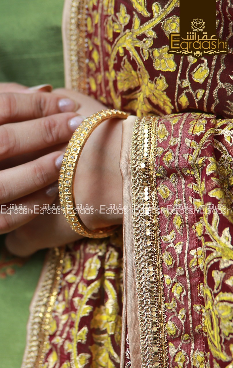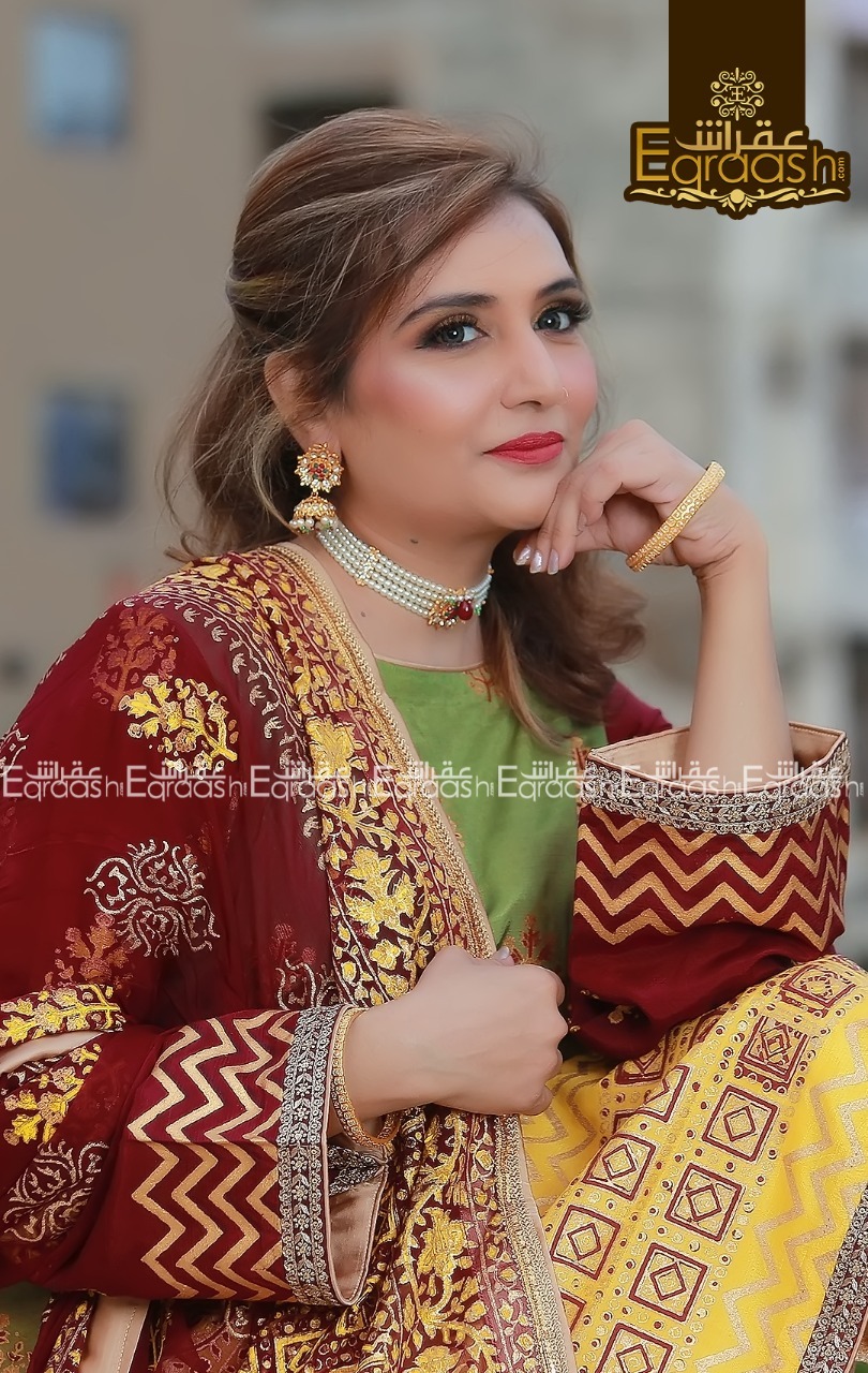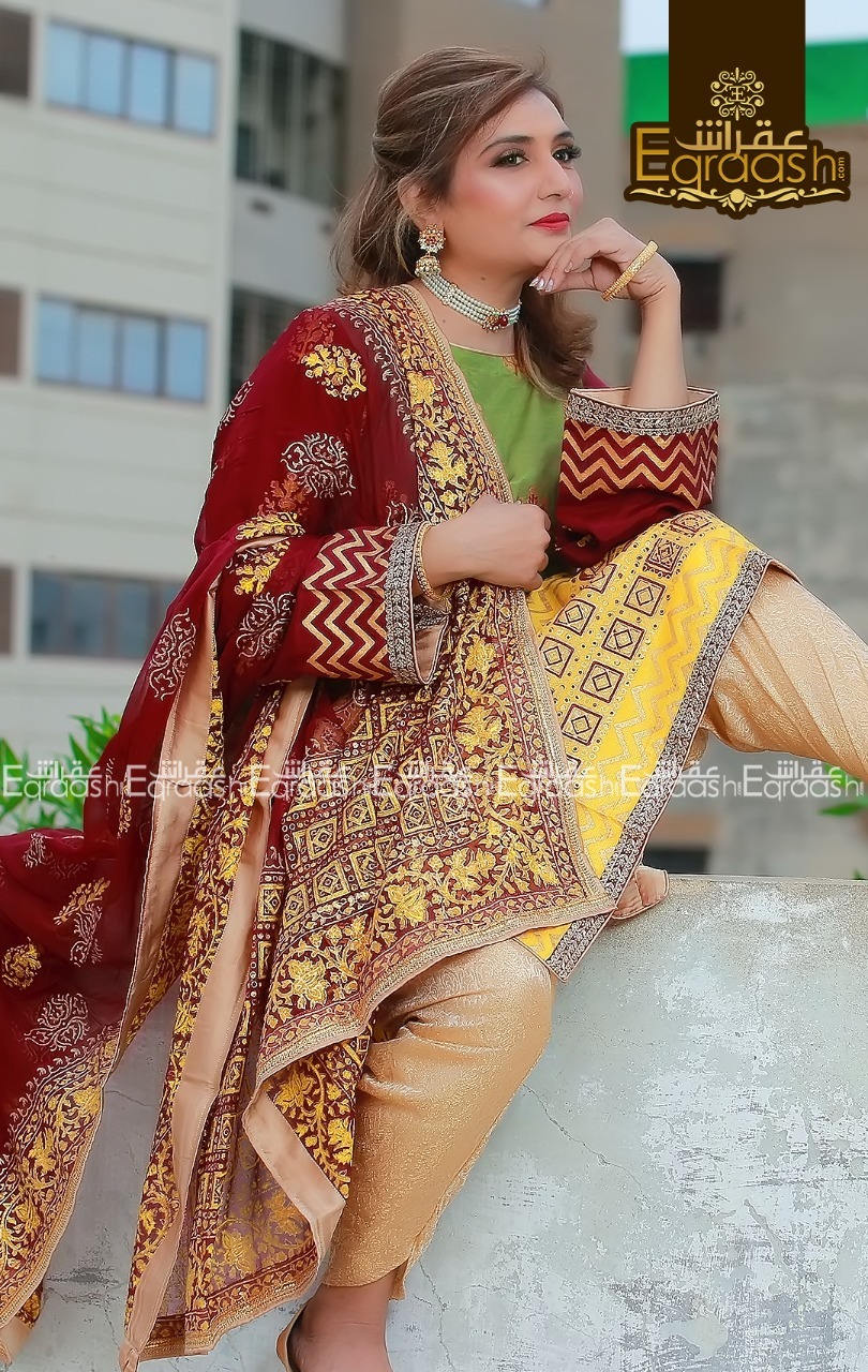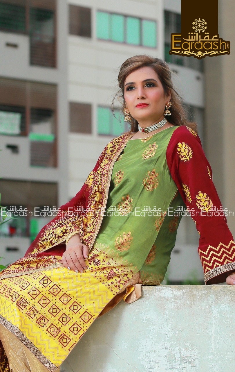 Luxurious hand-printed rawsilk shirt paired with organza hand-printed Duppata stitched with jamawar pipen finishing gota laces