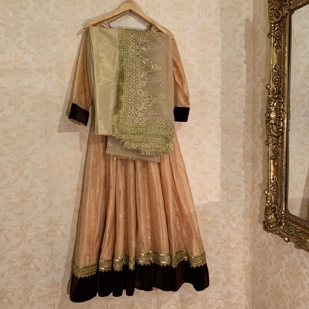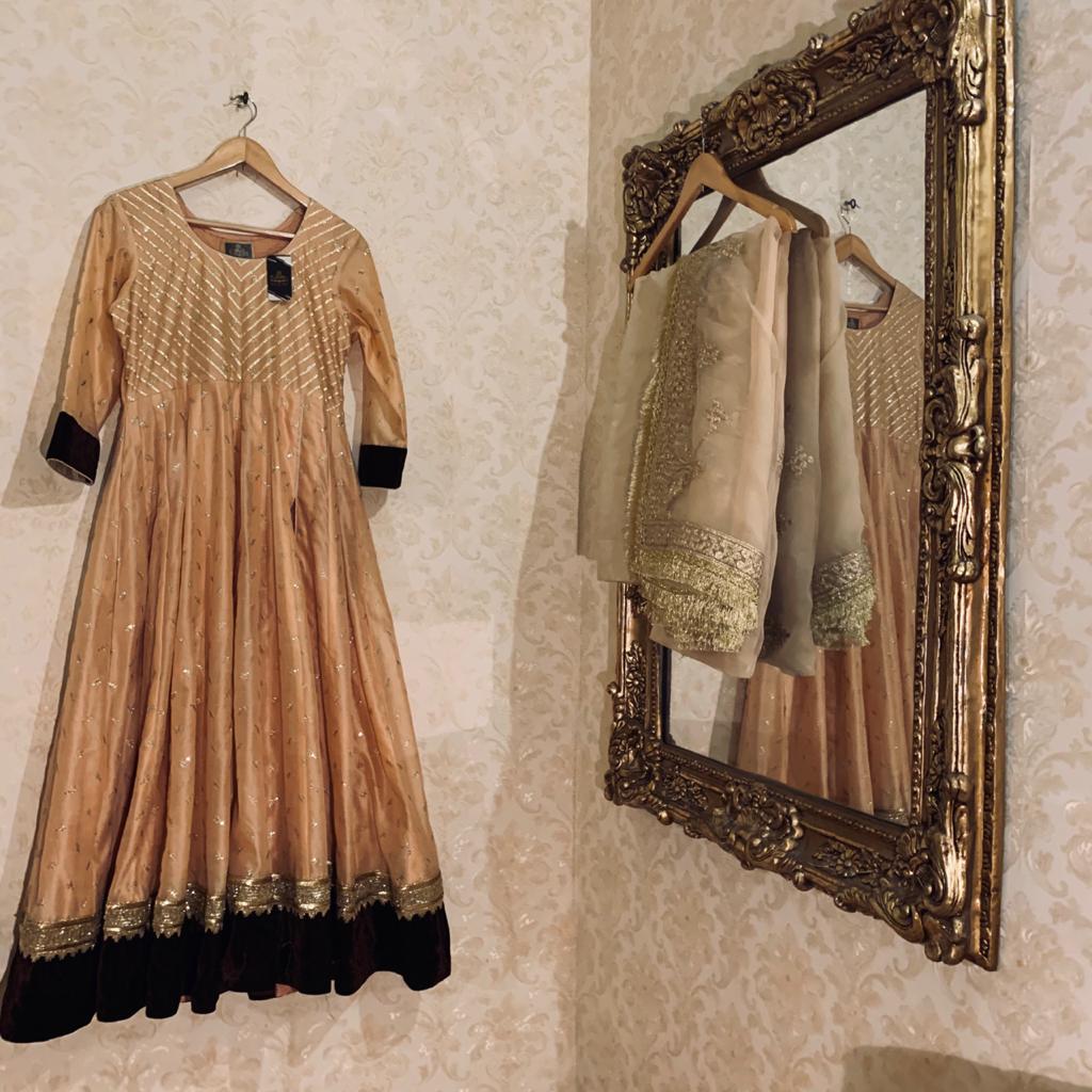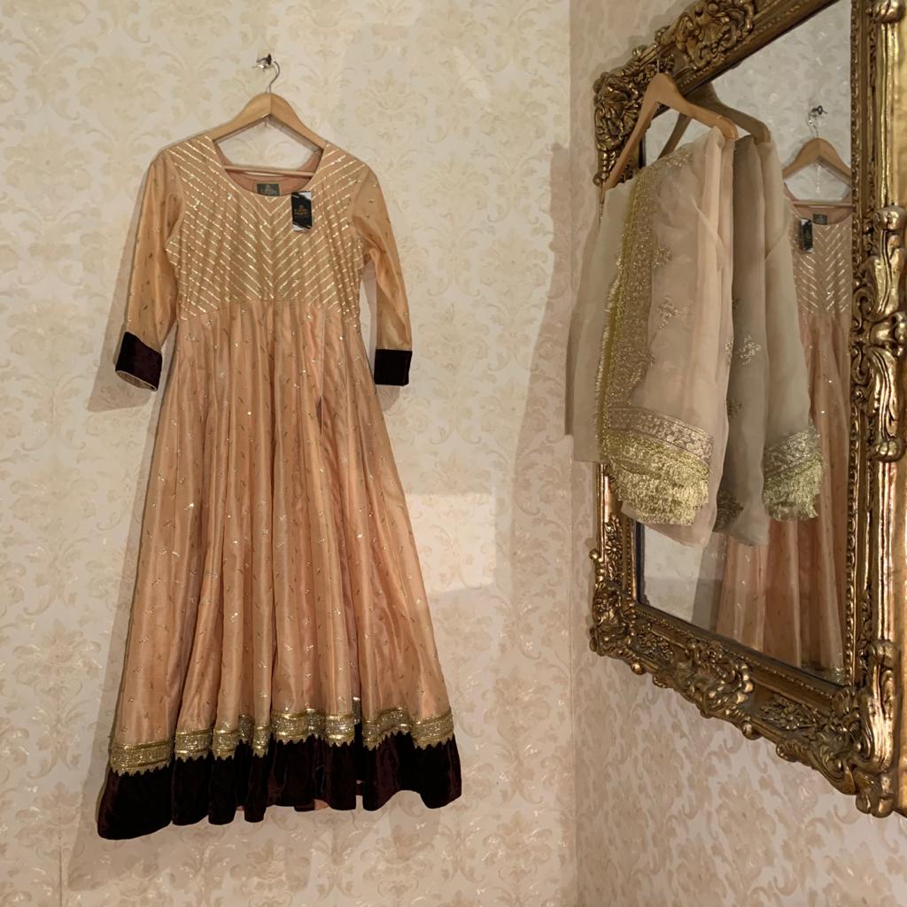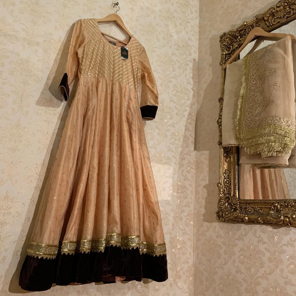 Embroidered Khaddinet anarkali with velvet border paired with gota work Organza Duppata and rawsilk trouser stitched with jamawar pipen finishing and gota lace