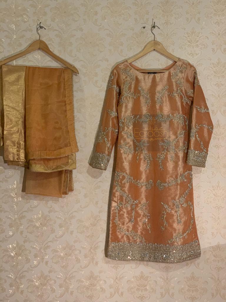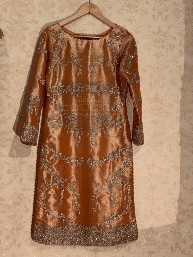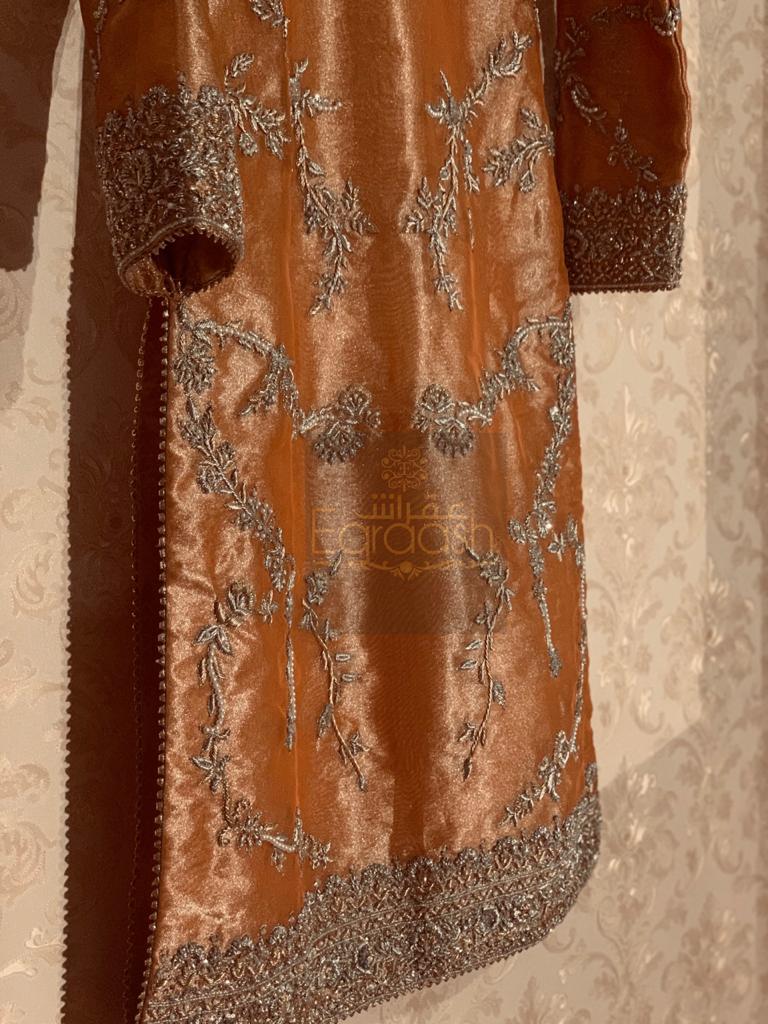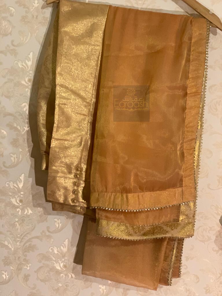 Lama Hand embellishment shirt paired with mesoori Duppata and jamawar trouser stitched with jamawar pipen finishing