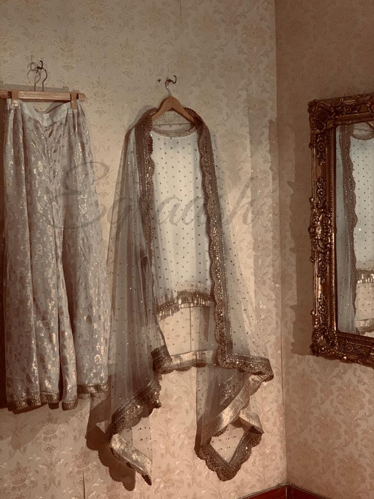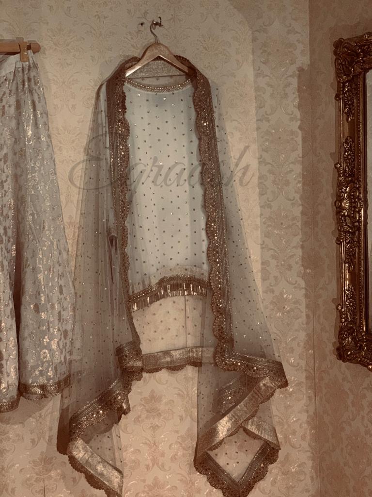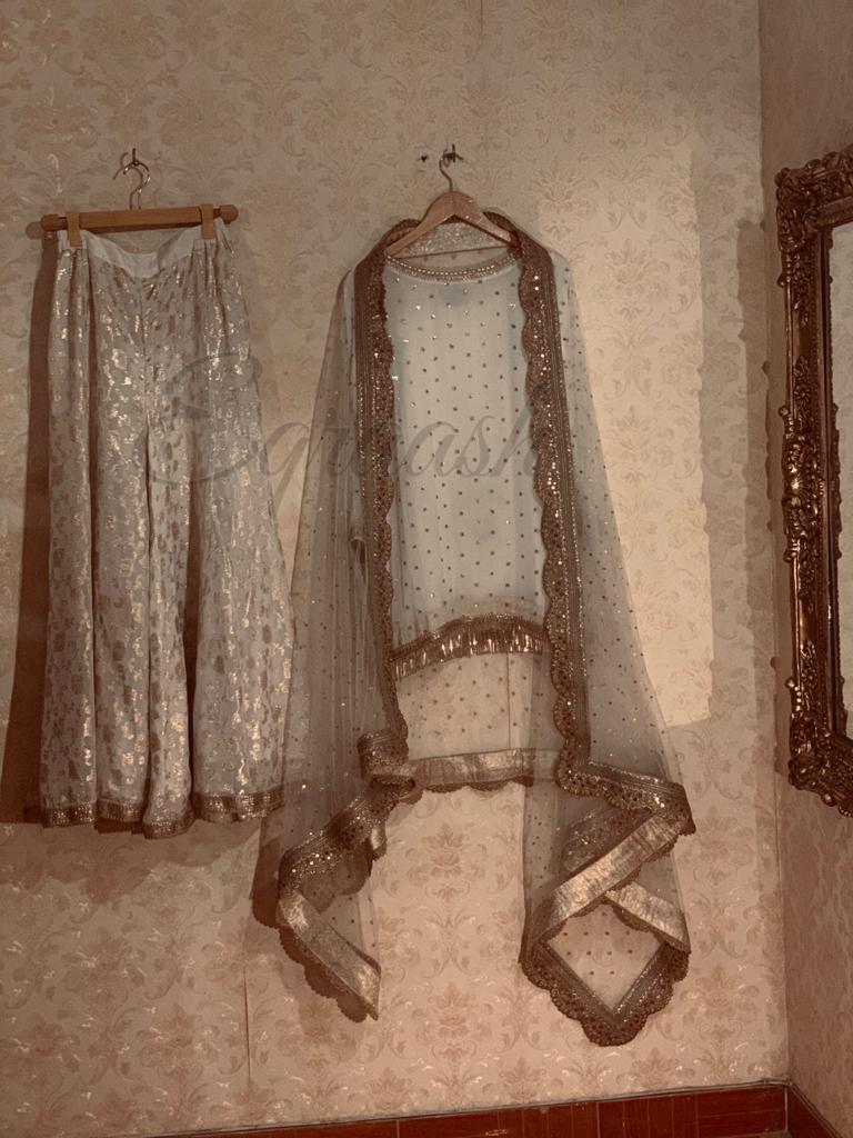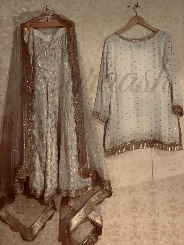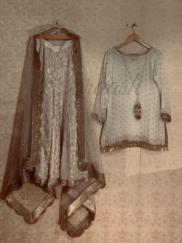 Chifon embroidered shirt paired with embroidered net Duppata with gota laces and pure lorex plazo stitched with jamawar pipen finishing and laces
