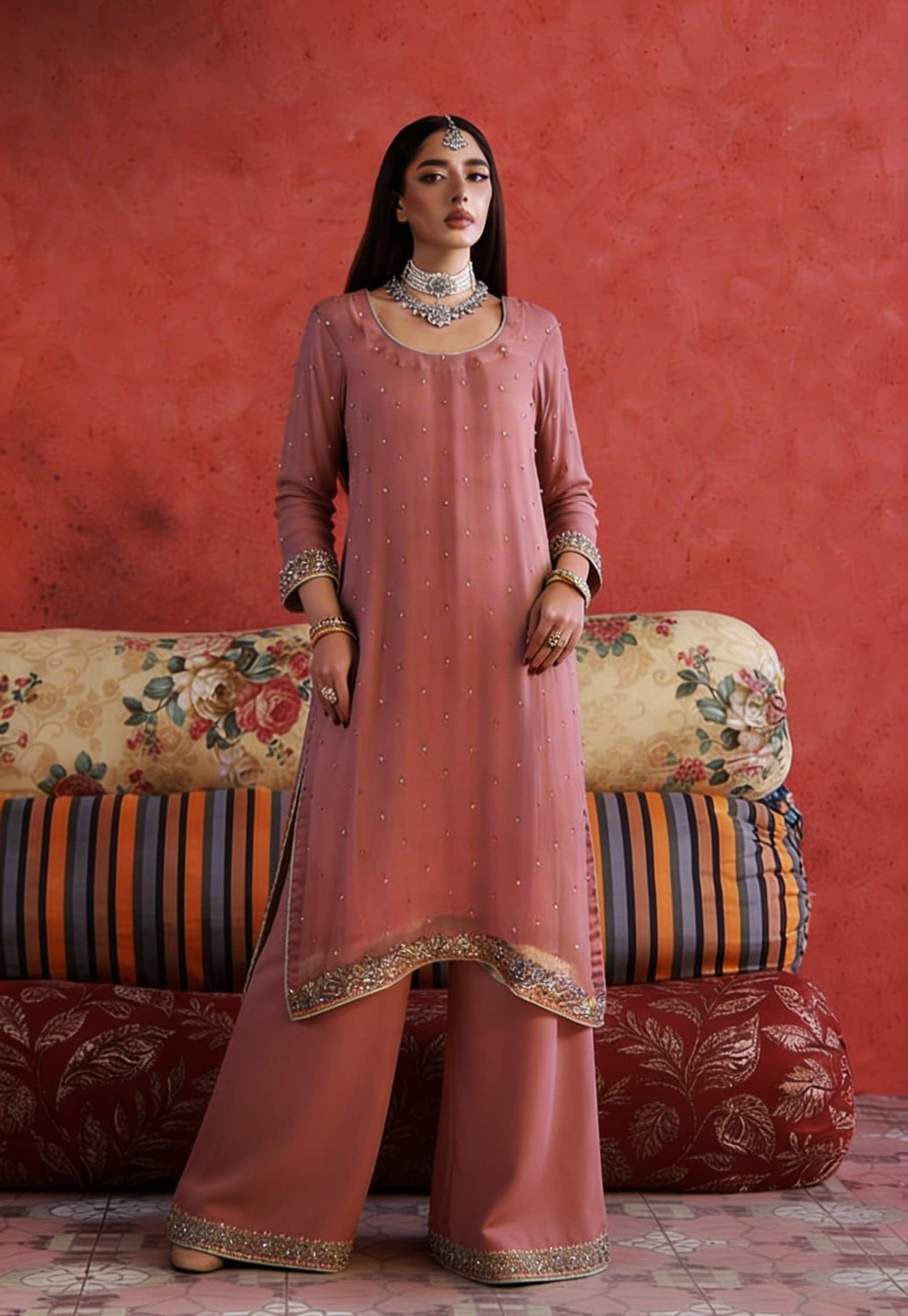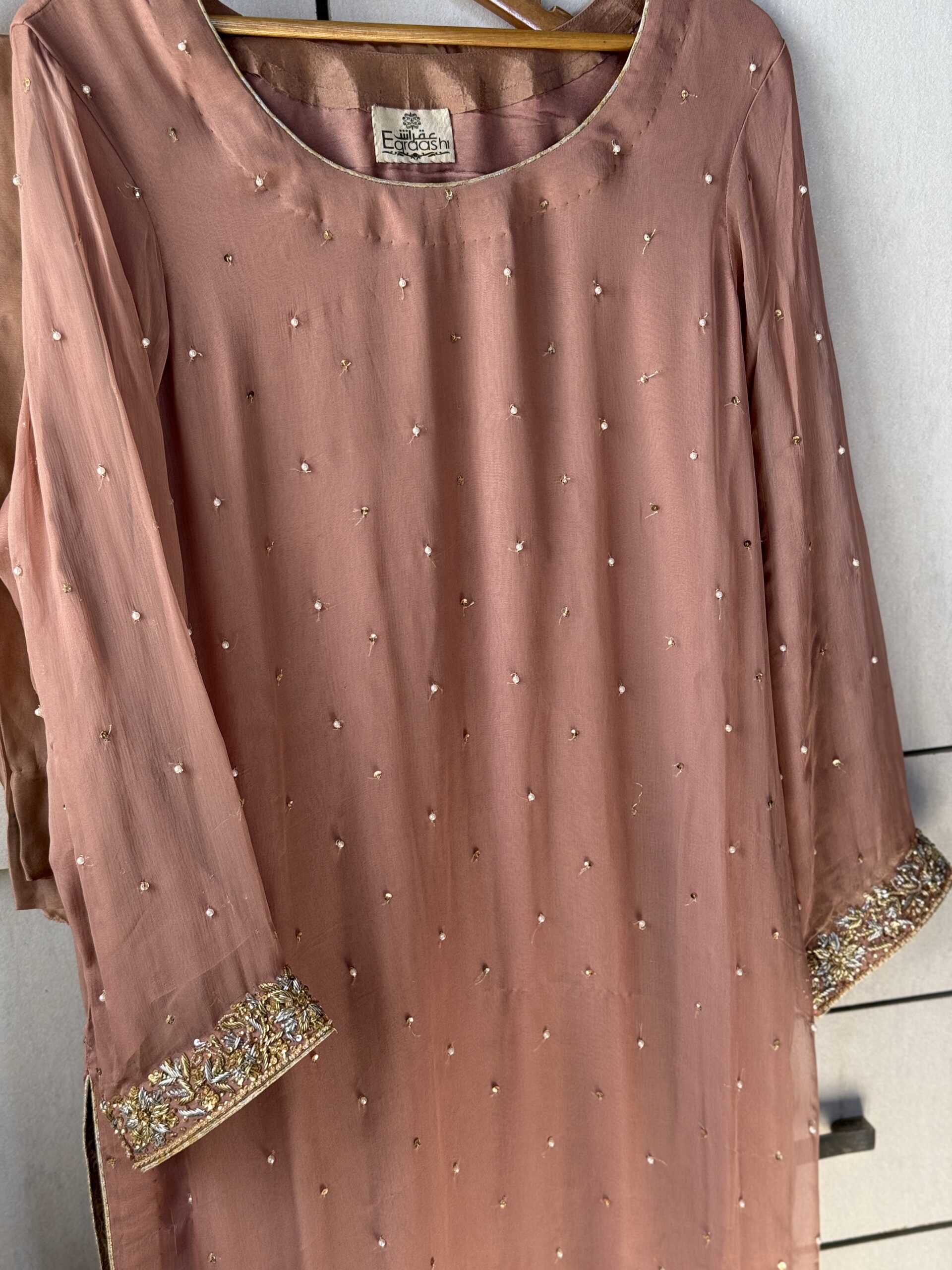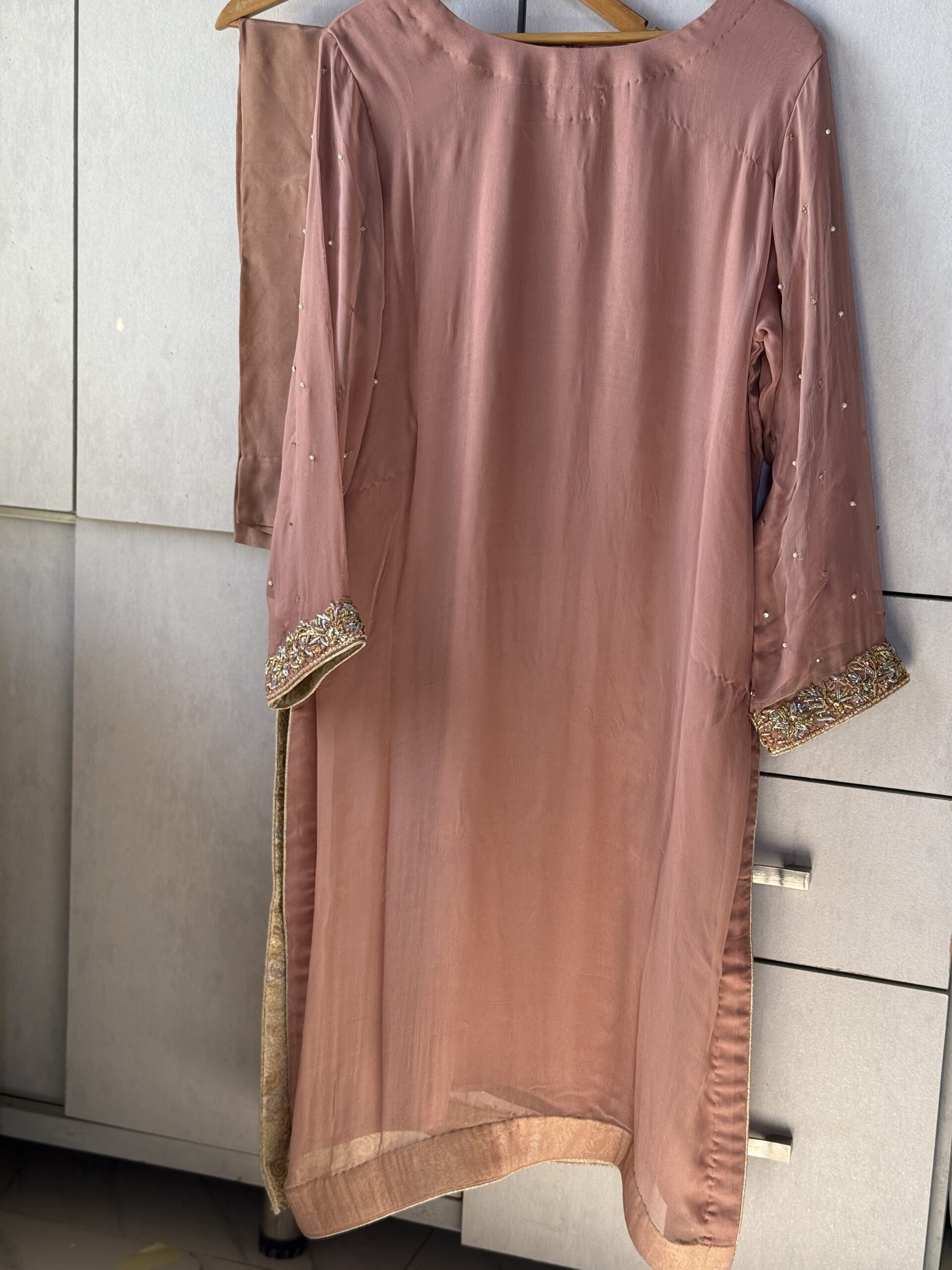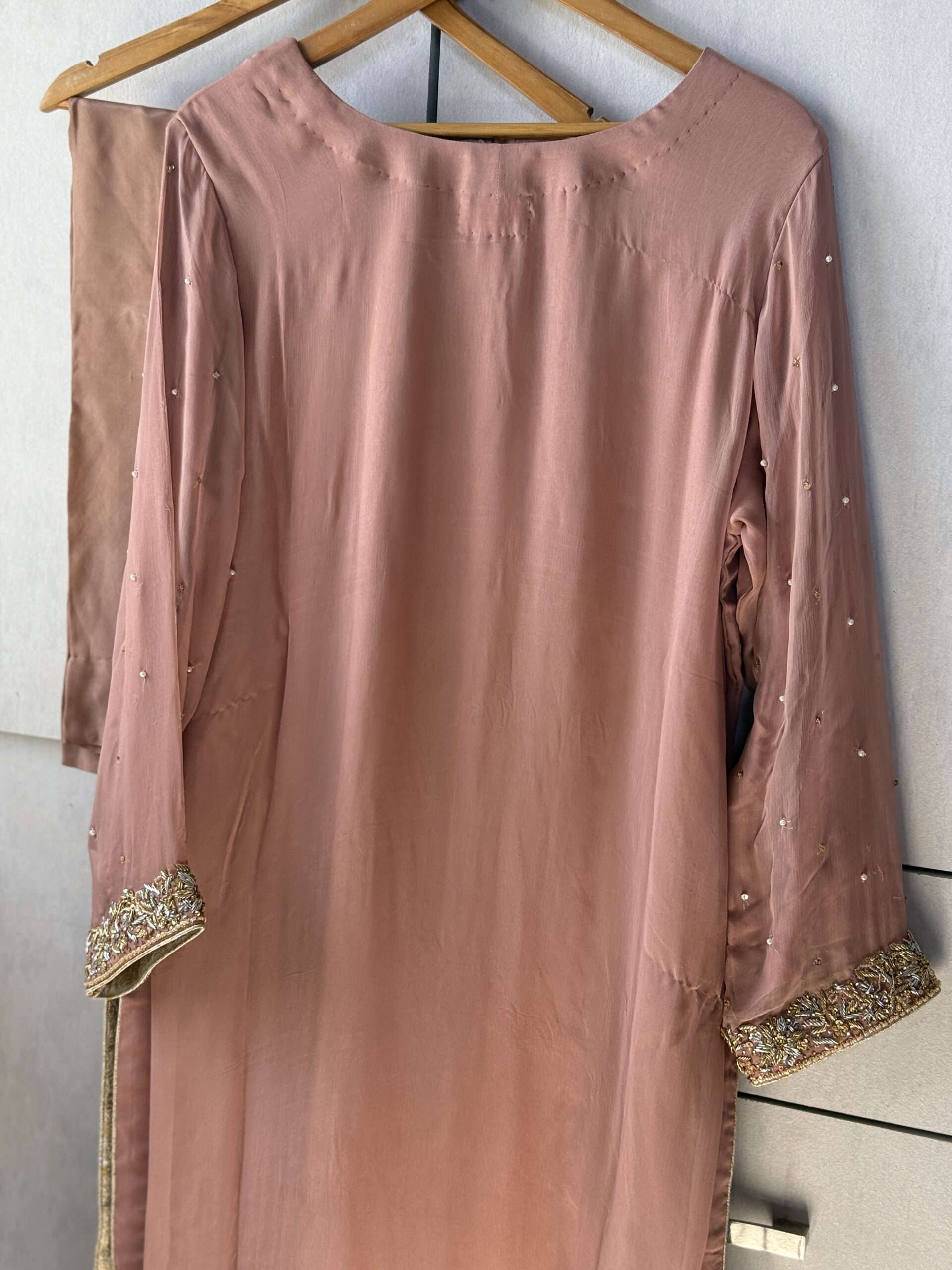 This Pure Chiffon outfit is crafted from a high-quality material that is exceptionally soft, light, and see-through, giving it a feeling as light as air. This thin, flowy fabric hangs beautifully on the body and provides the dress with a very graceful and expensive appearance. To enhance its elegance, the ensemble features a soft glow that makes it a perfect choice for weddings or fancy parties.