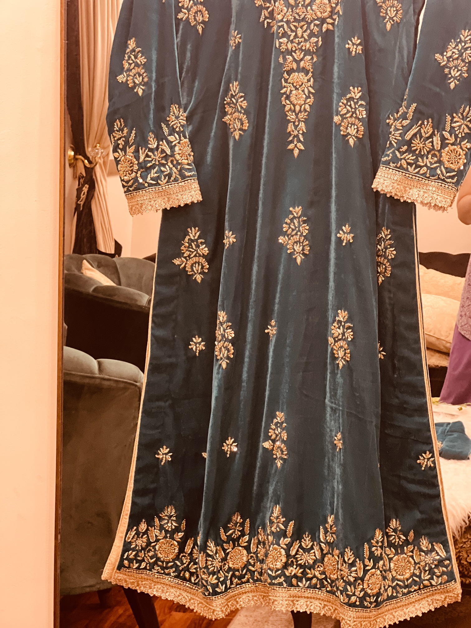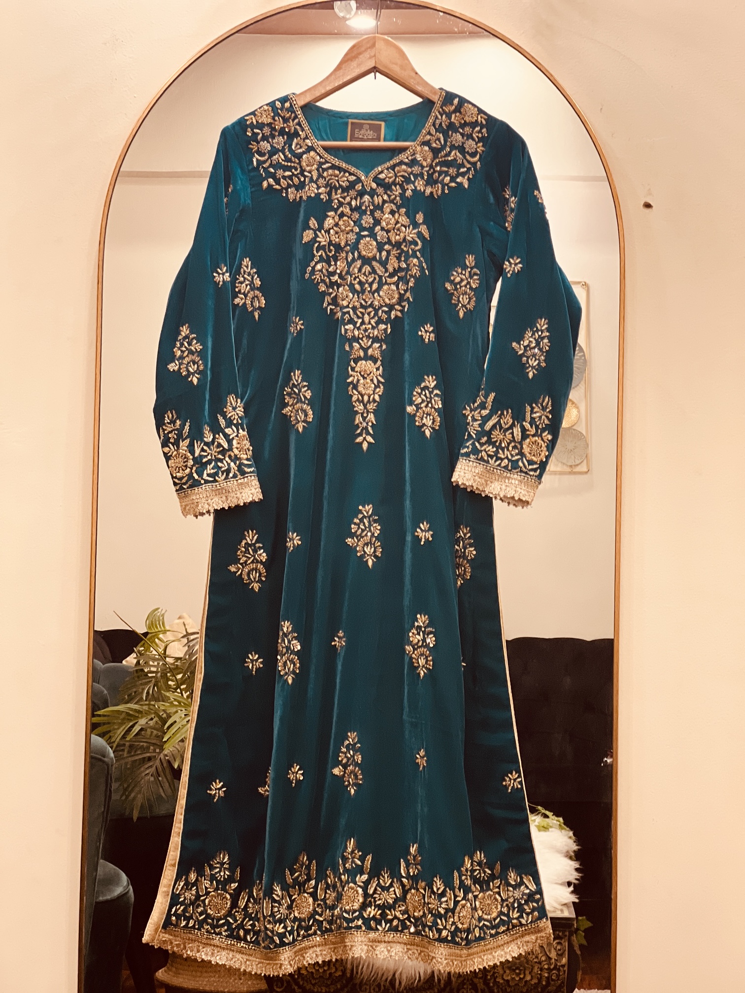 Created with a luxurious teal-blue velvet, this three-piece handcrafted suit is a stunning choice for special winter occasions. The shirt is richly decorated with gold hand-embroidery, featuring a large floral pattern in the center and smaller gold motifs scattered all over the front. The neckline and sleeves are finished with thick, shimmering gold borders, while the bottom of the shirt is decorated with an extra-wide floral lace edge. This outfit combines the soft, heavy feel of premium velvet with high-end gold artistry for a truly royal appearance.