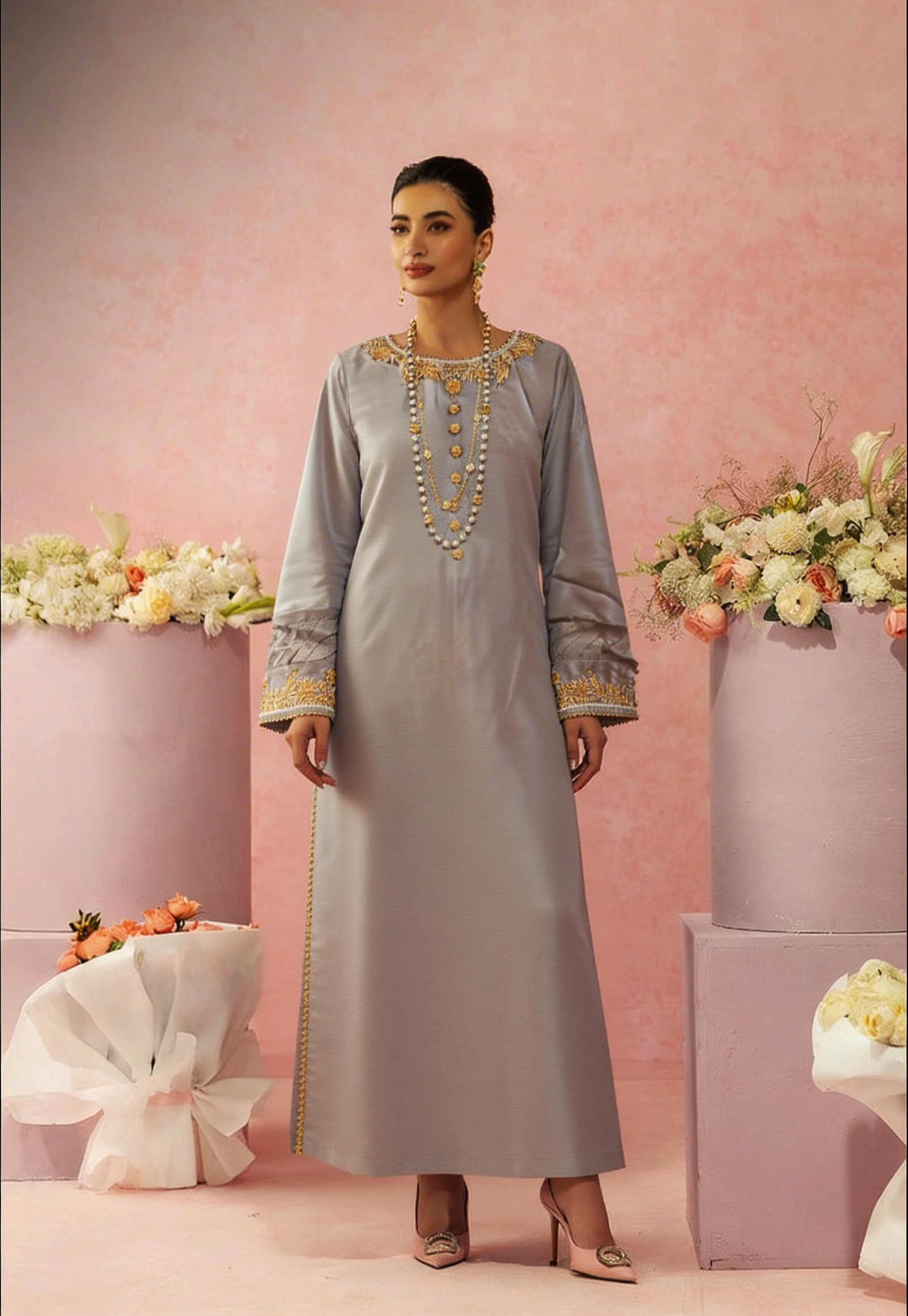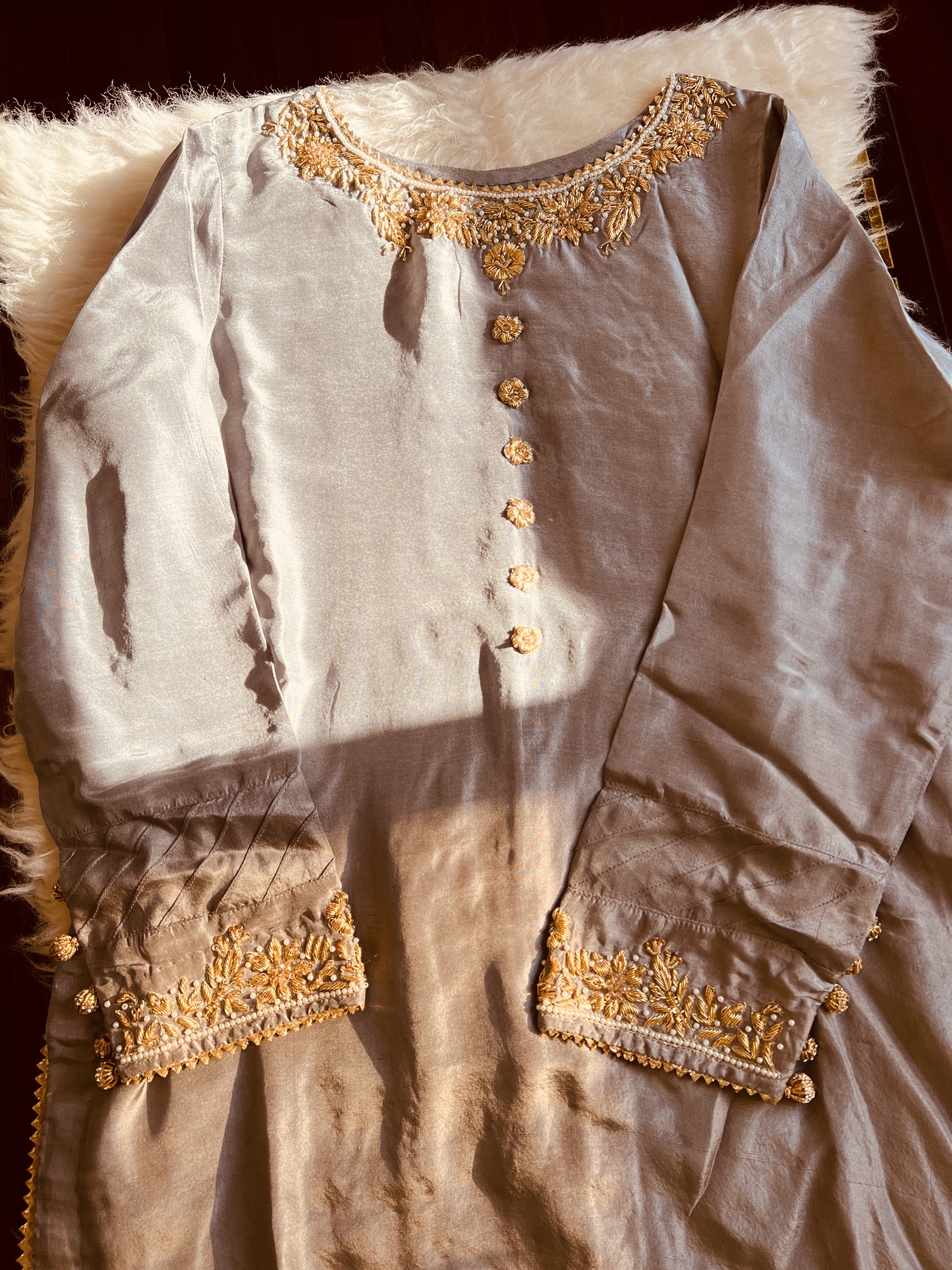 Created with a elegant grey silk fabric, this three-piece handcrafted suit features beautiful gold and pearl details for a very graceful look. The neckline is decorated with a wide, round border of gold floral hand-embroidery mixed with white pearls. A line of matching gold floral buttons runs down the front of the shirt to add a clean, stylish touch. The sleeve cuffs are the highlight, featuring unique diagonal pleats, gold embroidery, and small hanging gold beads along the edges.