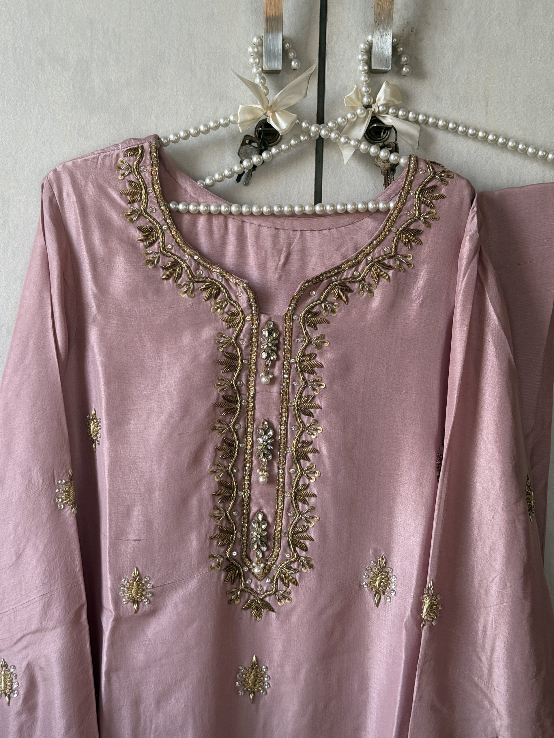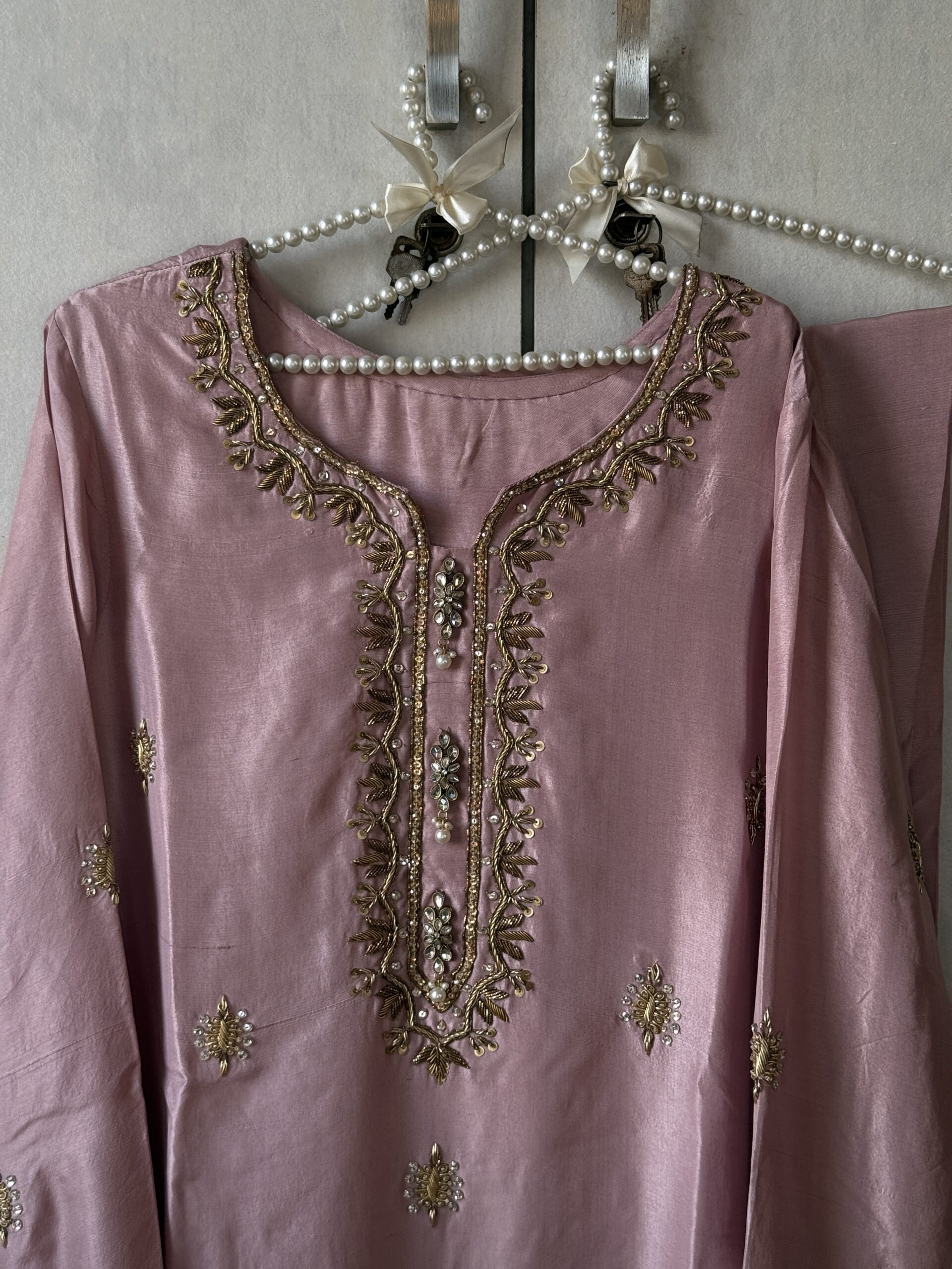 Highlighted by a soft lilac silk fabric, this three-piece handcrafted suit features elegant gold and crystal details. The neckline has a V-shape with gold floral embroidery and three crystal buttons. Small gold motifs are scattered across the shirt, while the sleeves are finished with matching embroidered borders and a delicate gold trim.