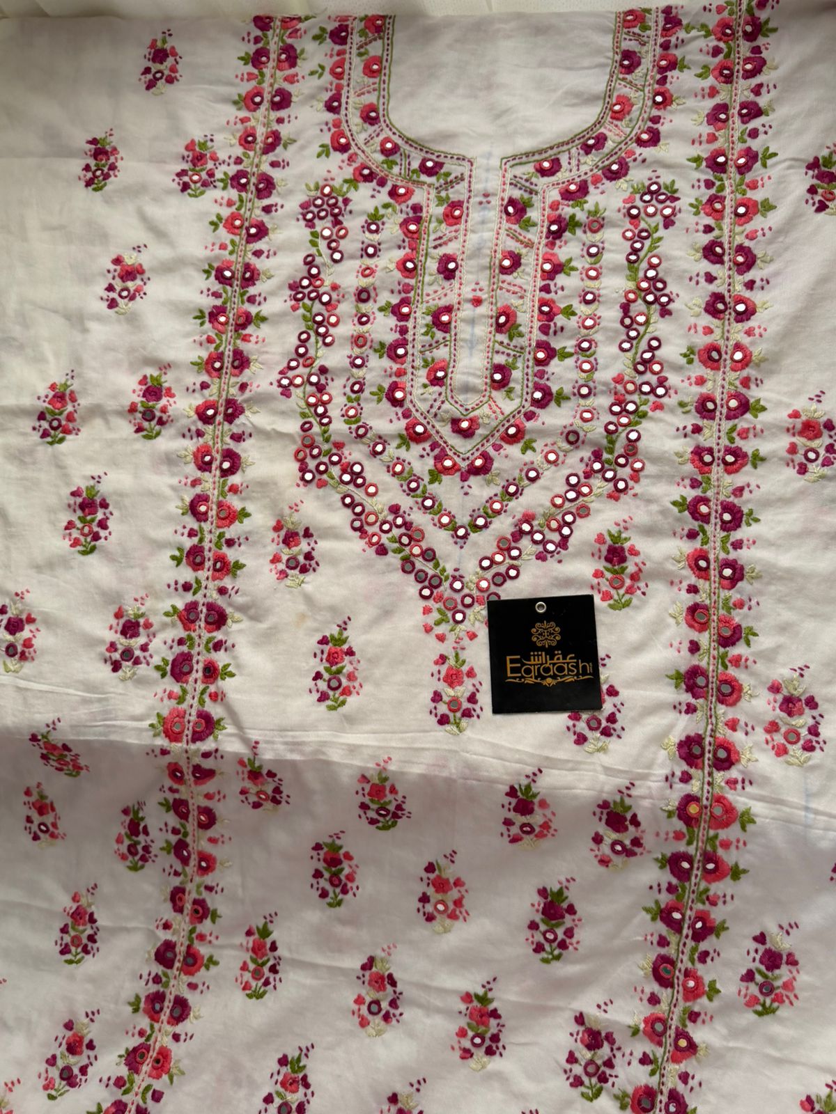 Showcasing intricate hand embroidery, this custom-made kurta is designed with beautiful floral patterns and small reflective accents. The piece features a detailed neckline and is neatly finished with crochet laces and a soft inner lining for extra comfort. Since it is custom-made, you can choose any fabric or size that suits you best.