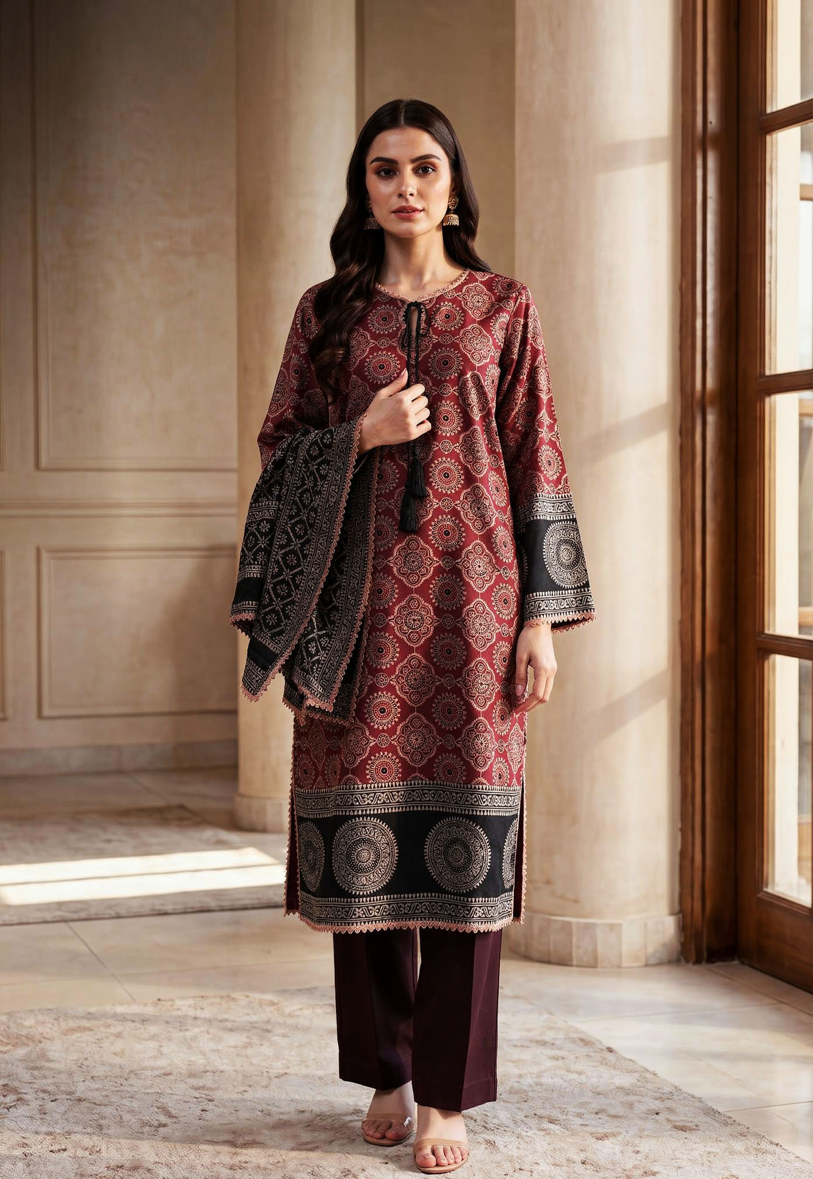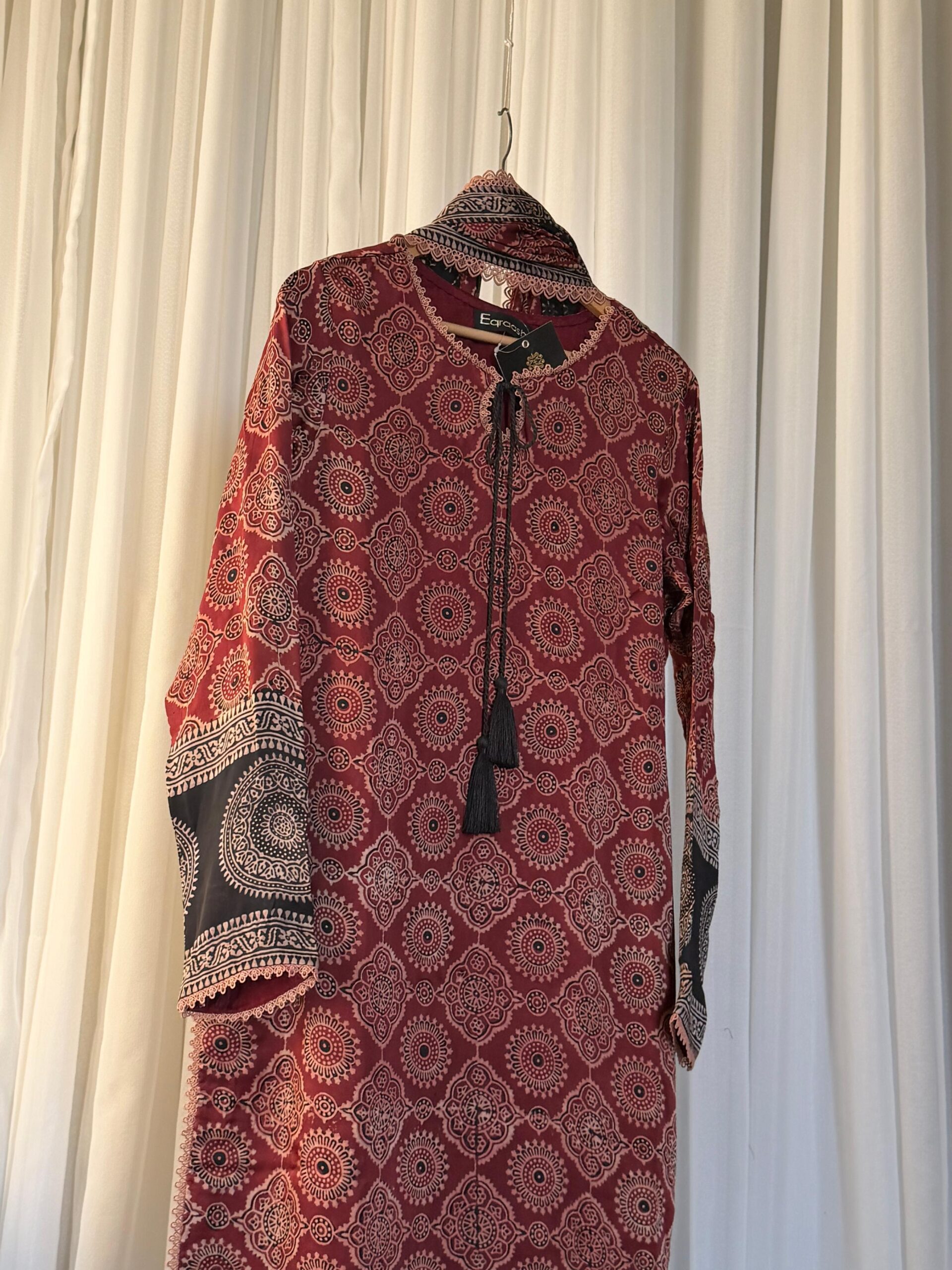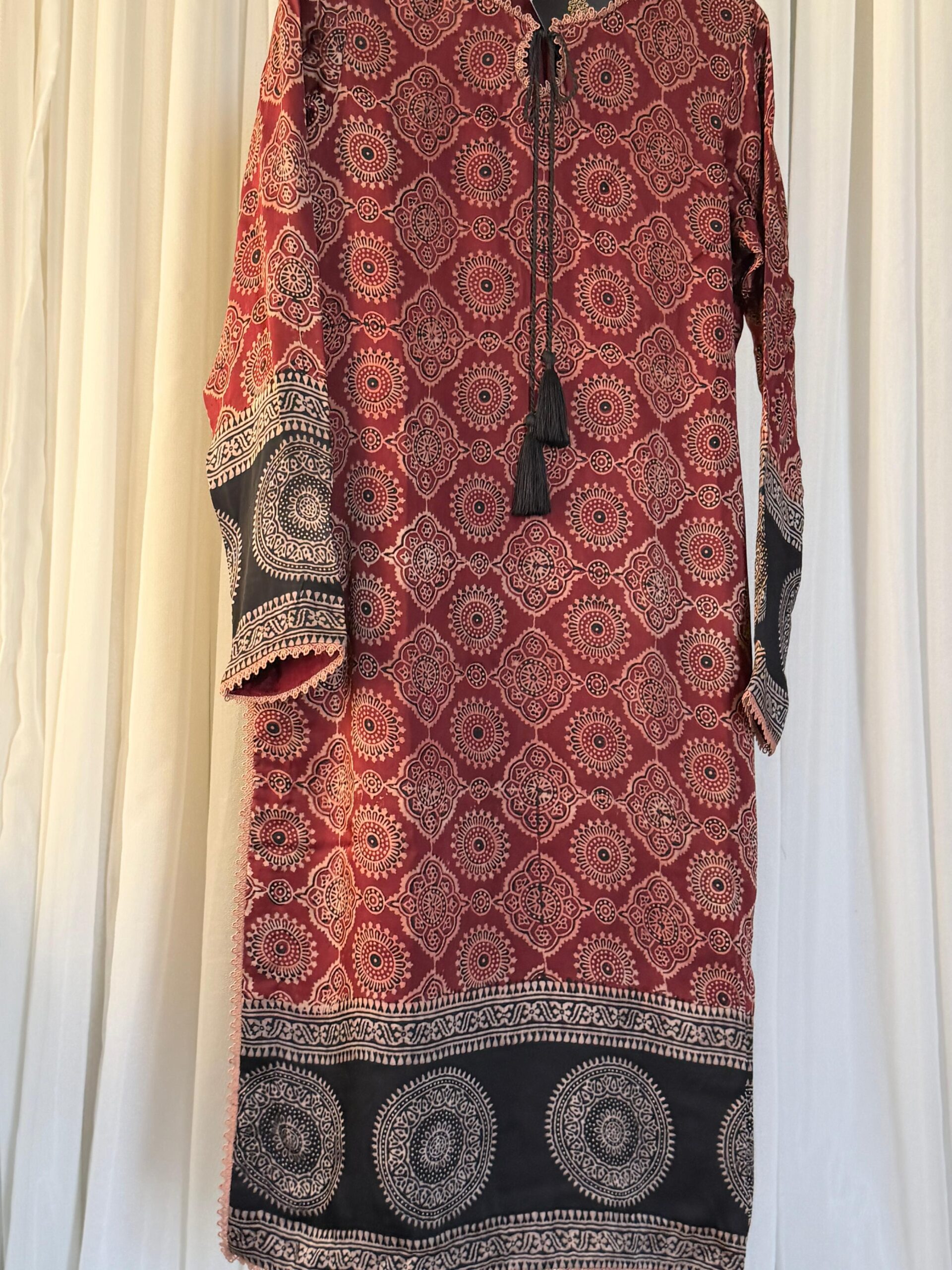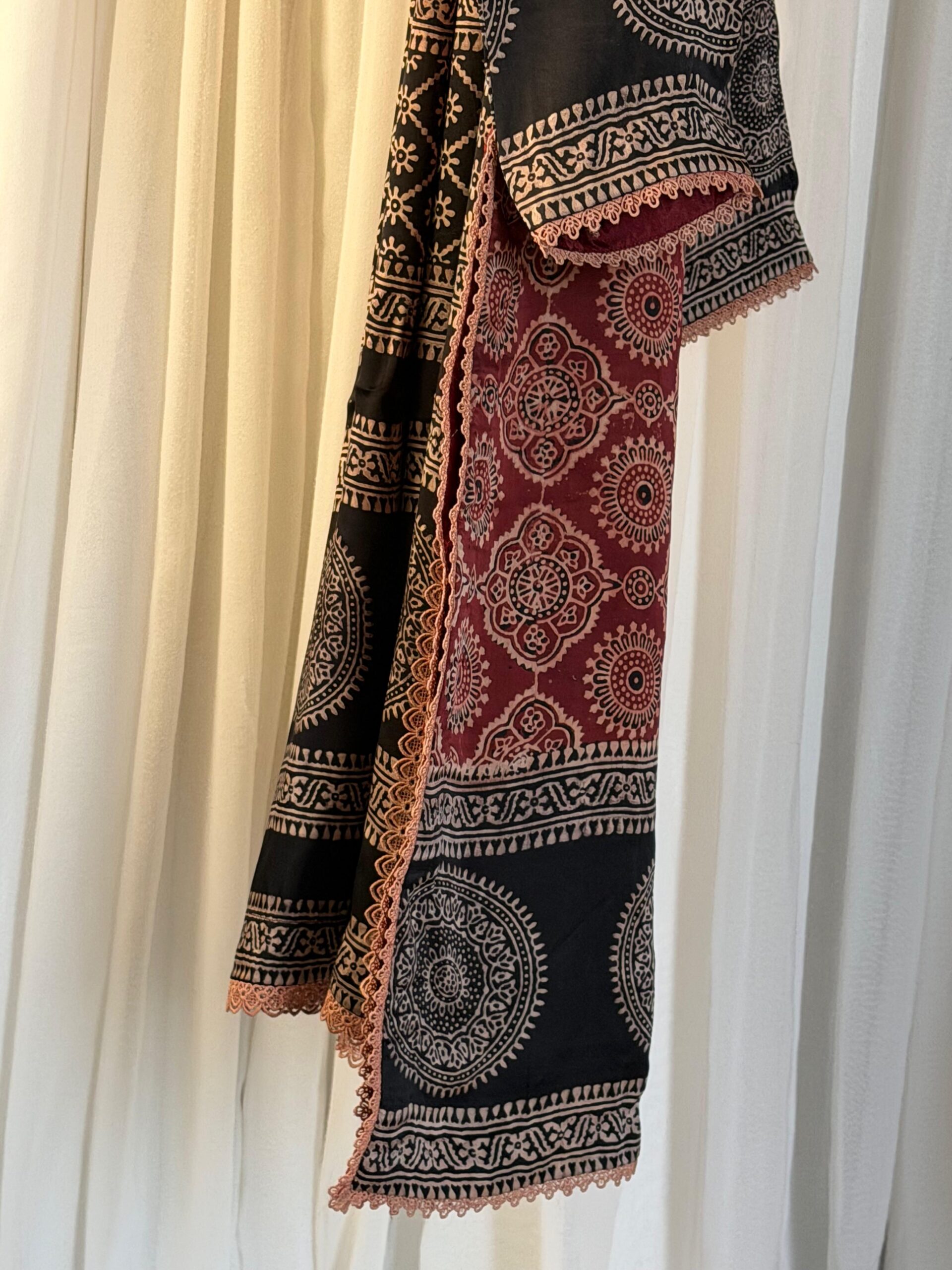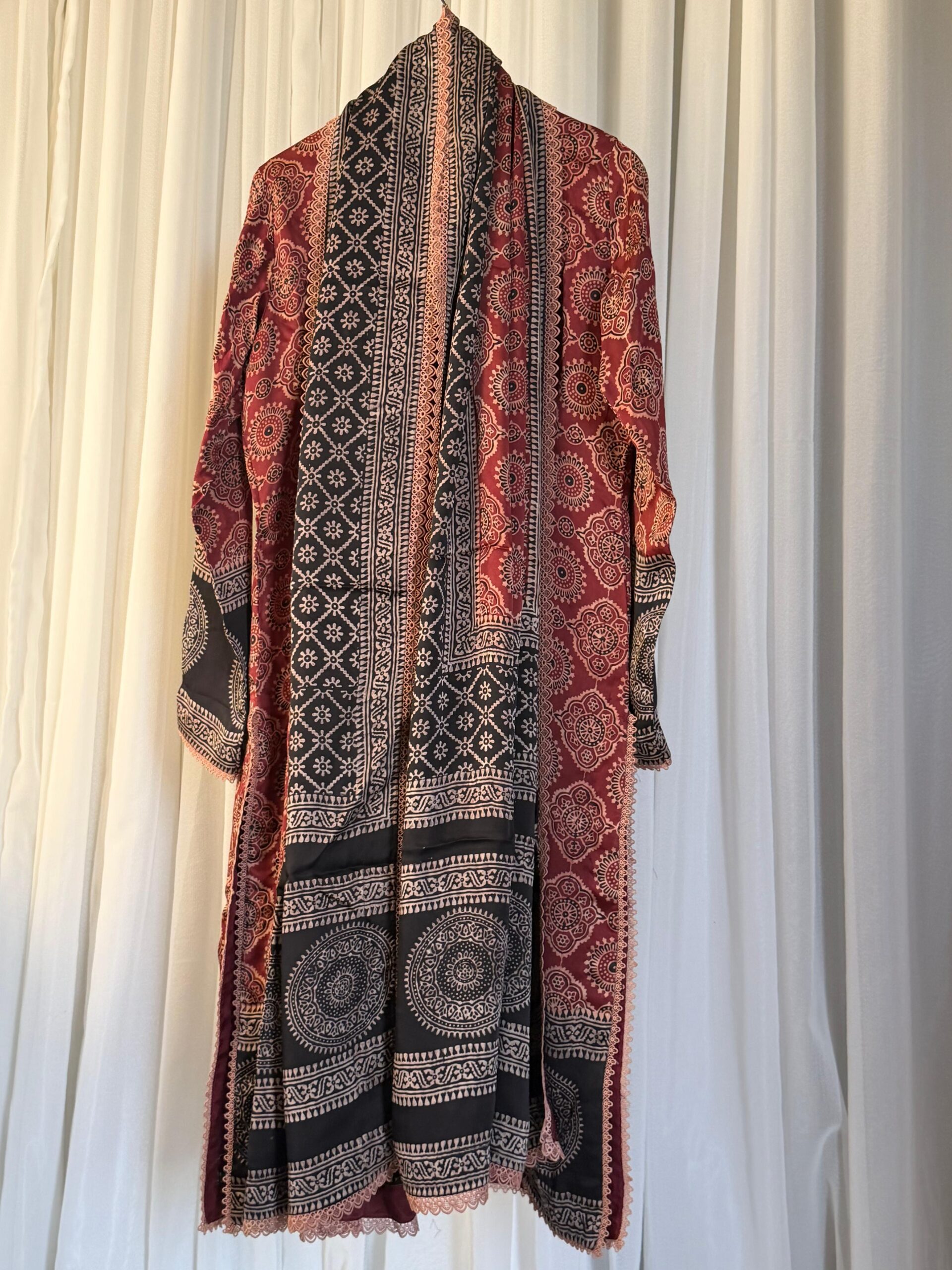 This Pure Korean Charmeuse Silk Ajrak set is a semi-formal, three-piece outfit that combines traditional patterns with a luxury feel. The ensemble features a handcrafted shirt and shawl made with a natural, organic Ajrak block print, a classic style known for its rich cultural heritage and geometric designs. To complete the look, the outfit includes matching pants made from smooth and soft Korean Charmeuse silk.