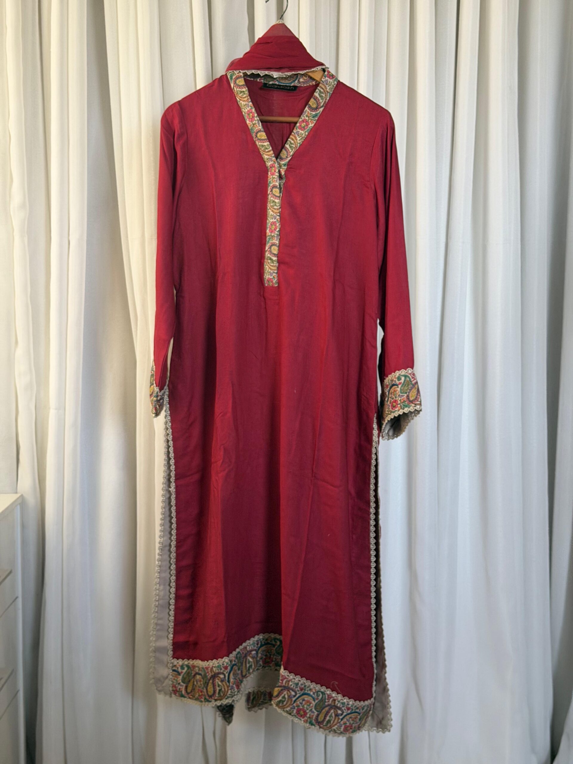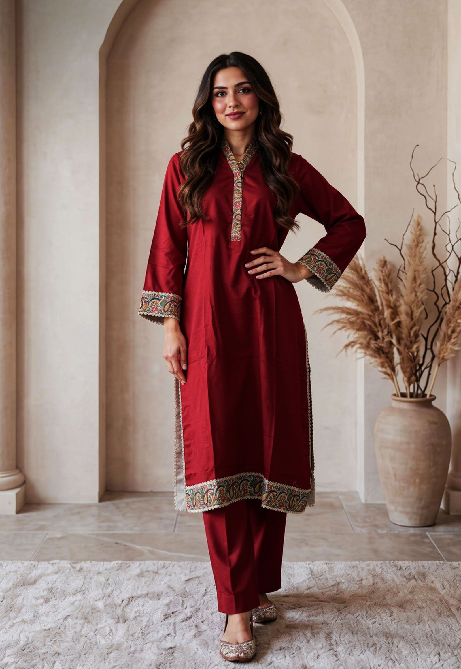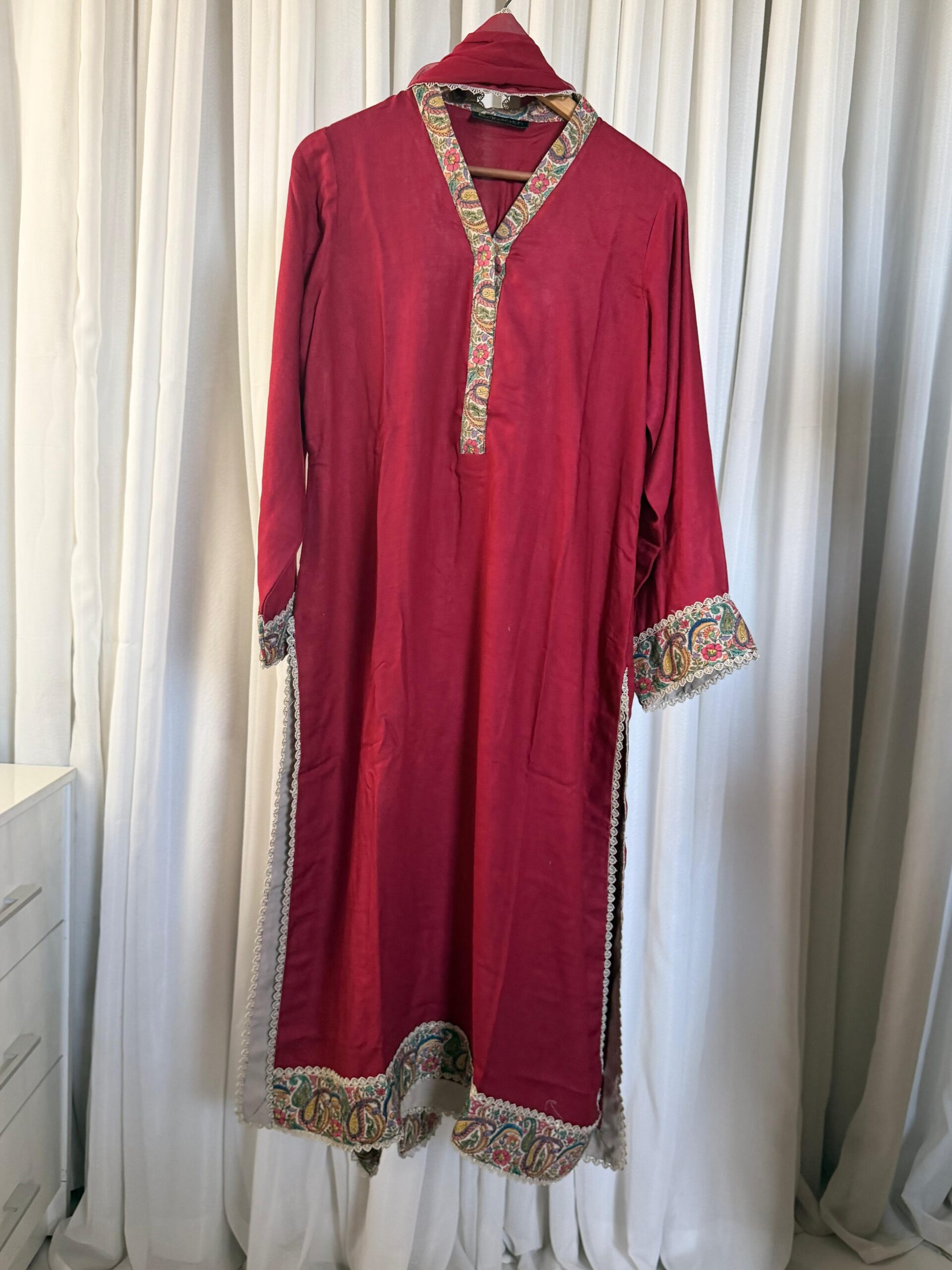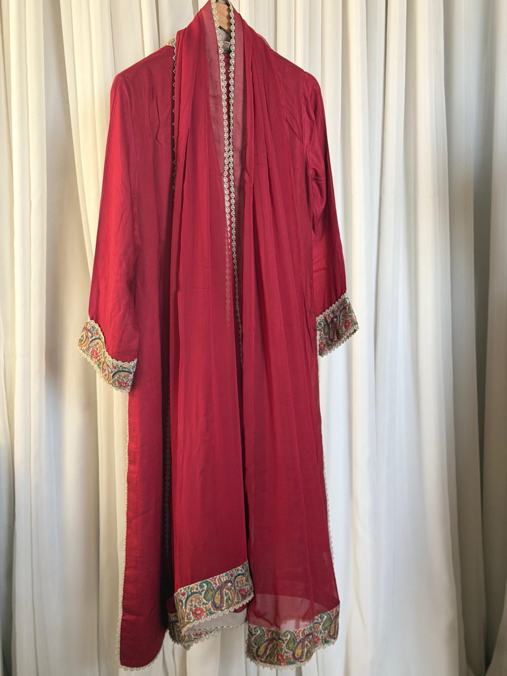 Handcrafted three-piece suit comes in a deep, vibrant red that looks very traditional and bold. The shirt features beautiful hand-done embroidery on the neckline, sleeves, and hem, using classic paisley and floral patterns. With delicate lace edges and a matching dupatta, this outfit is a great choice for weddings or festive parties where you want a royal look.