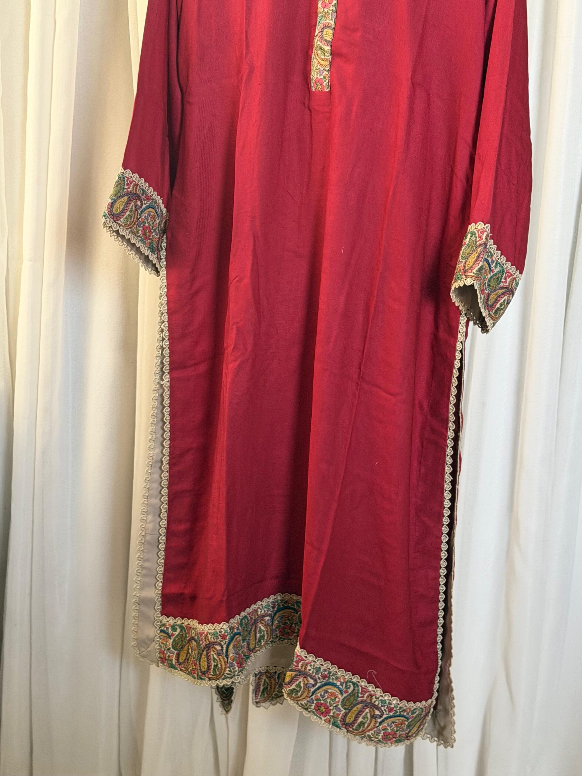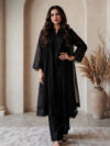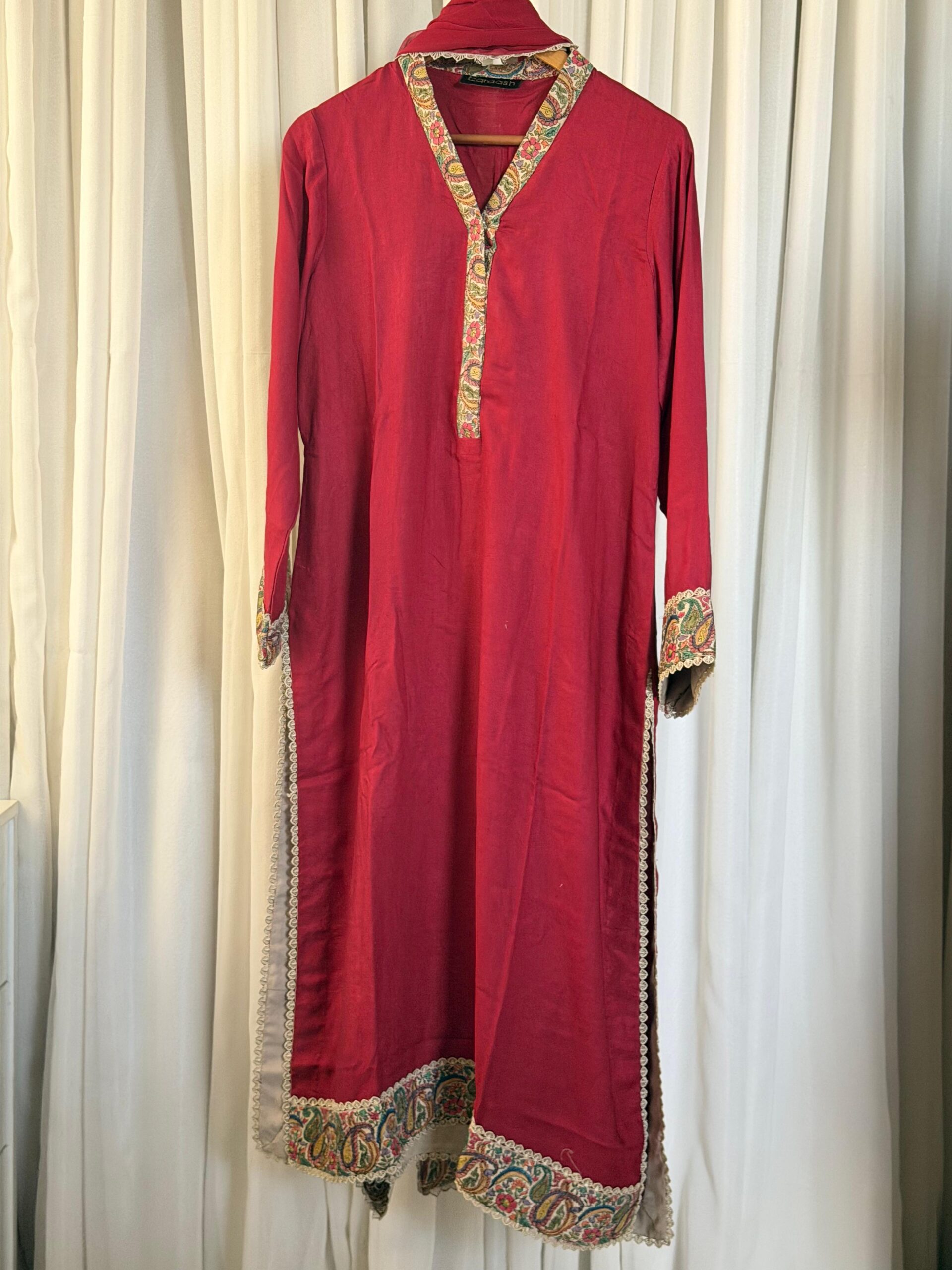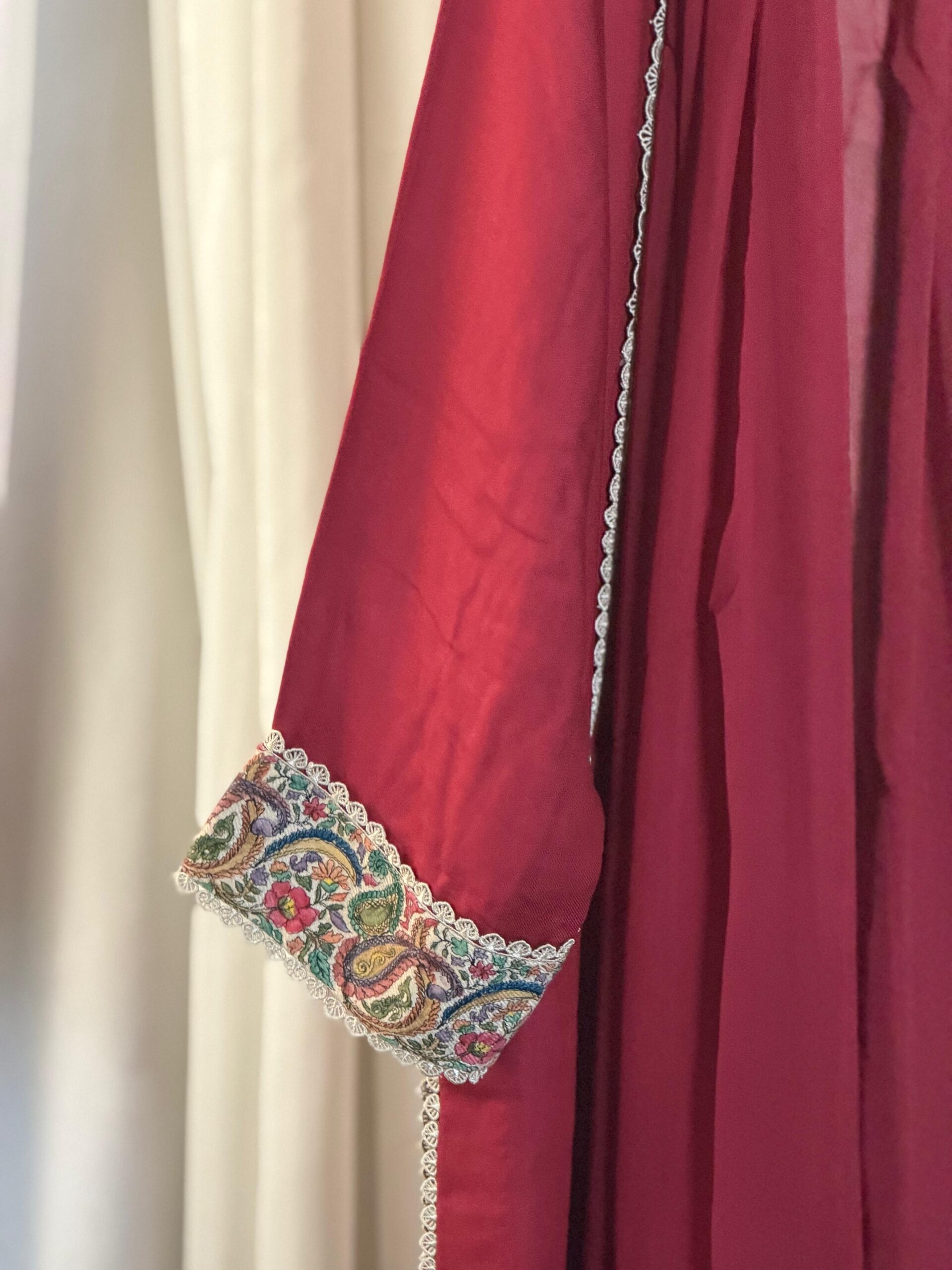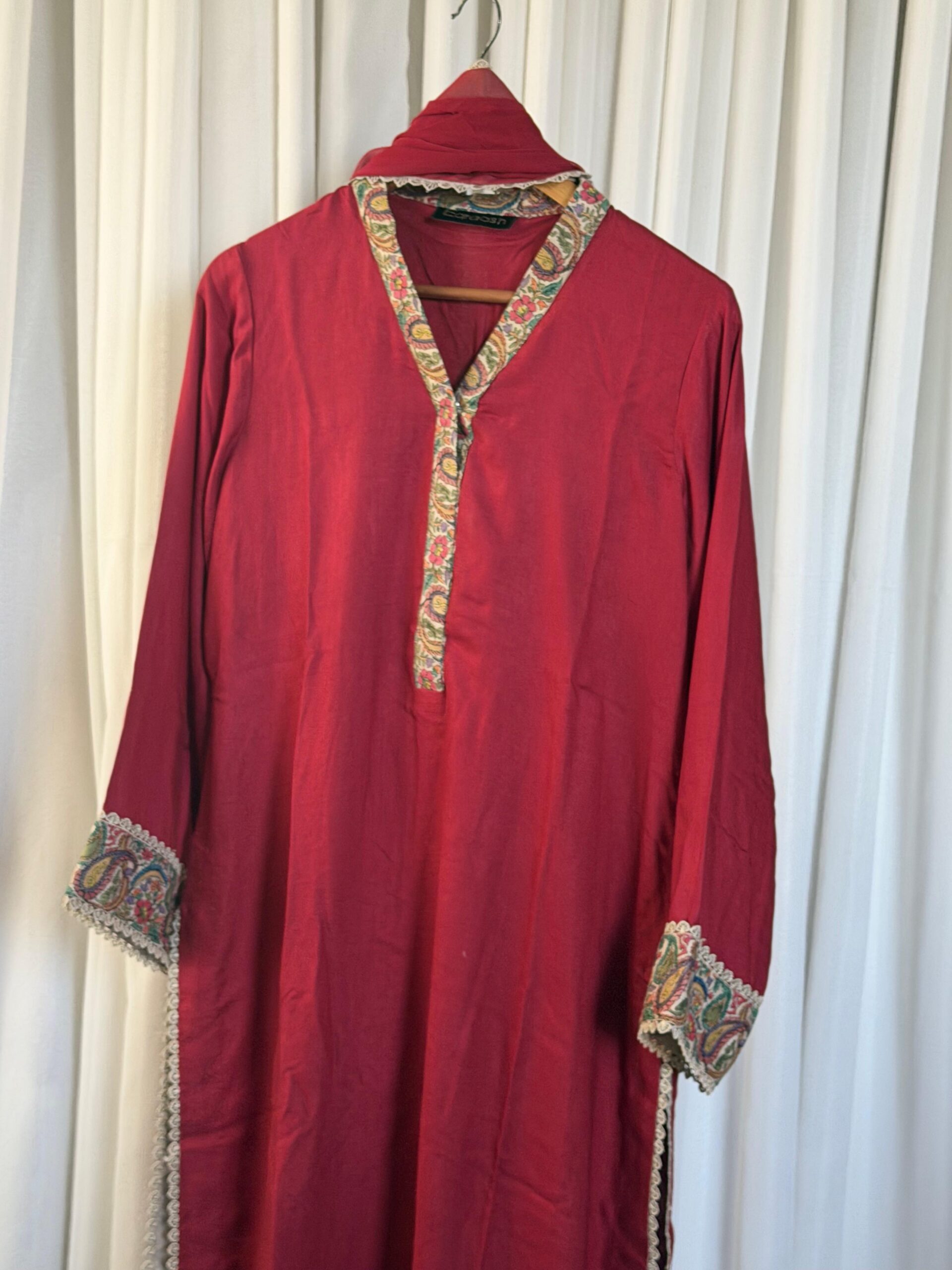 Handcrafted three-piece suit comes in a deep, vibrant red that looks very traditional and bold. The shirt features beautiful hand-done embroidery on the neckline, sleeves, and hem, using classic paisley and floral patterns. With delicate lace edges and a matching dupatta, this outfit is a great choice for weddings or festive parties where you want a royal look.