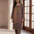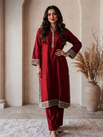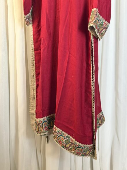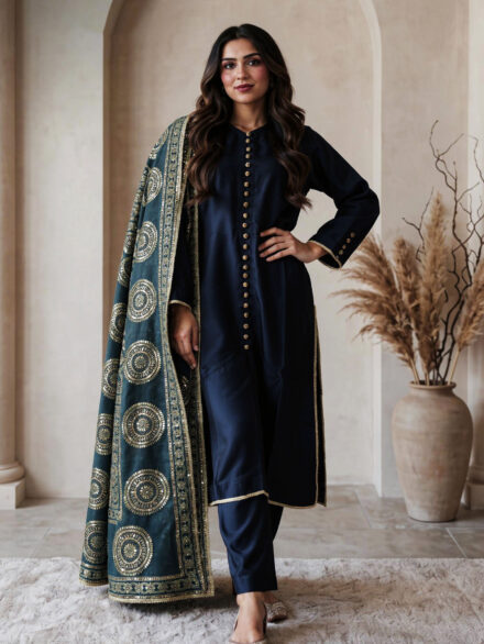 This beautiful three-piece suit features a traditional all-over block print in warm earth tones. The shirt is highlighted by a heavy, shimmering gold neckline and matching borders on the sleeves and hem. Crafted with a delicate scalloped edge, this handcrafted ensemble is a perfect mix of cultural heritage and festive shine for special events.